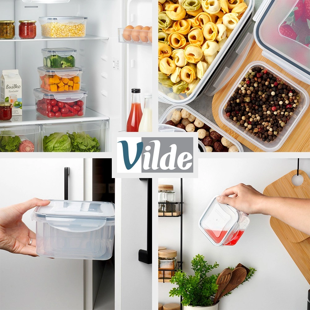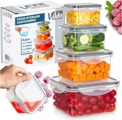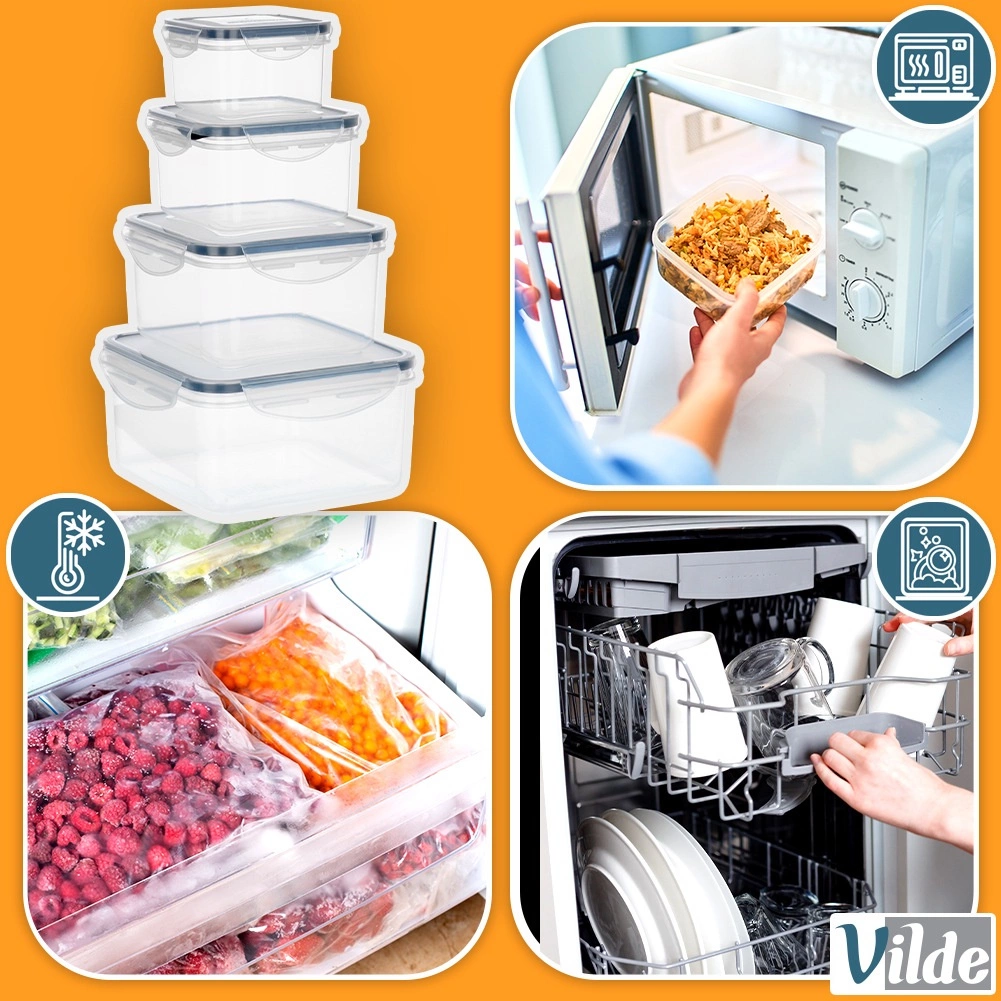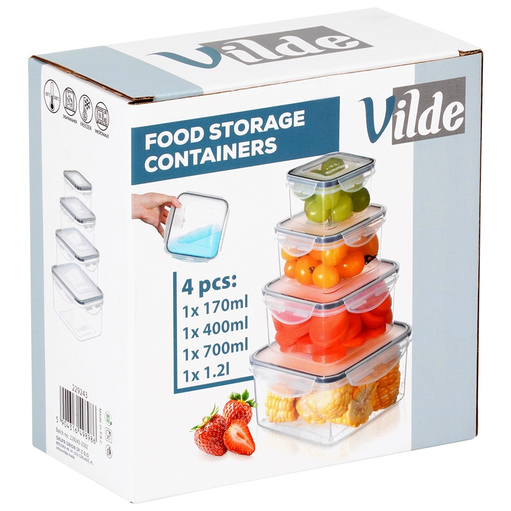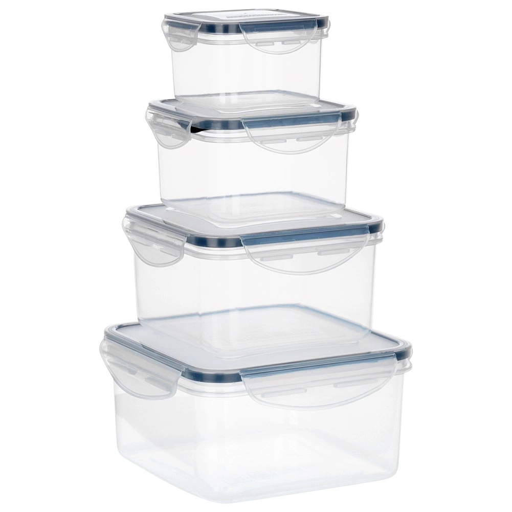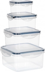Dette alsidige sæt med fire kvadratiske bokse hjælper med at holde orden i køkkenet og forlænge madens friskhed. De gennemsigtige sider gør det nemt at tjekke indholdet uden at åbne, og låg med fire låseklapper samt silikonepakning sikrer pålidelig tæthed. Boksene kan stables ind i hinanden for at spare plads.