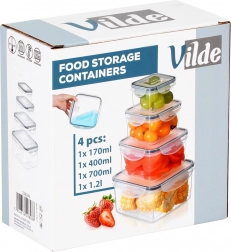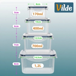 Praktisk sæt med fire gennemsigtige madbokse med solide kliklågs og silikonepakning for lufttæt og lækagesikker lukning. Forskellige størrelser (1,2 l, 700 ml, 400 ml, 170 ml) til organiseret opbevaring af mad derhjemme og på farten. Uden BPA, egnet til opvaskemaskine, mikrobølgeovn (uden låg) og fryser.