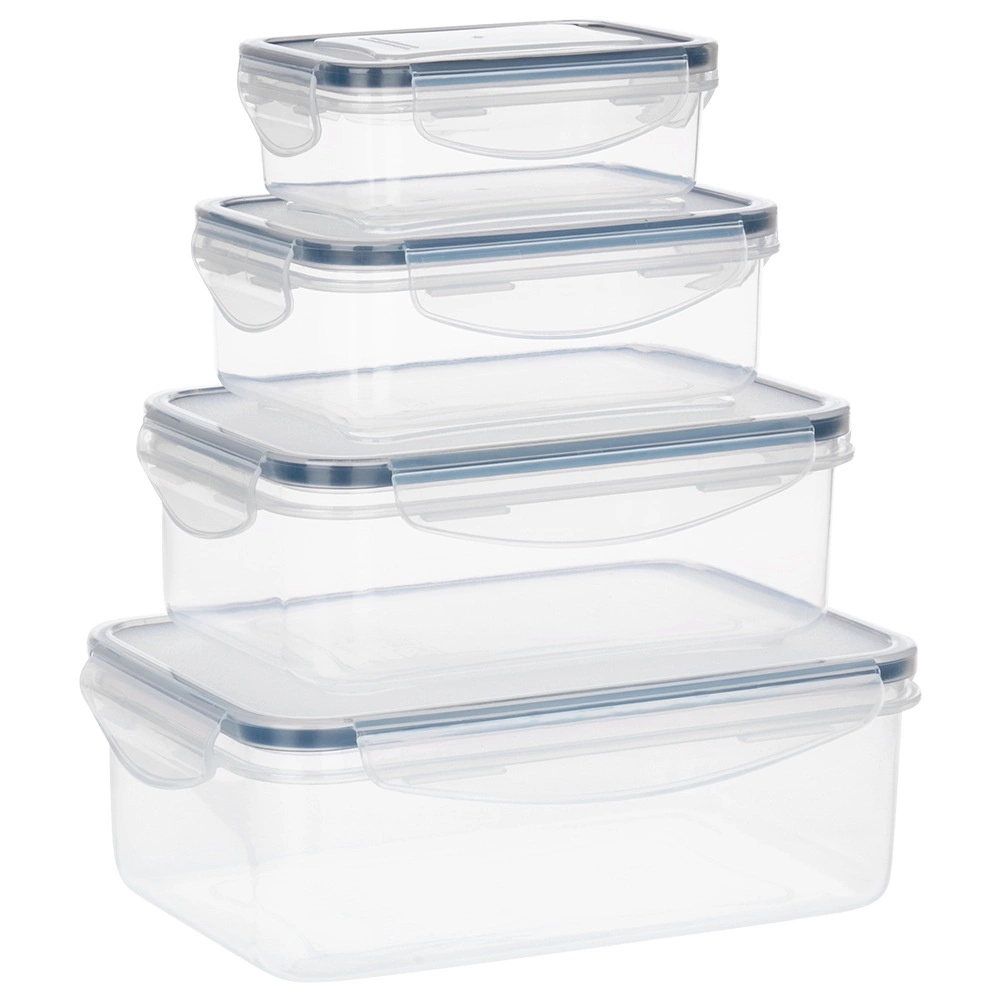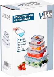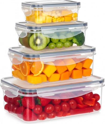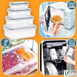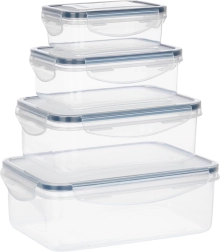 Praktisk sæt med fire gennemsigtige beholdere med låg og silikonepakning, der holder din mad frisk længere og sikkert opbevaret. Forskellige størrelser til opbevaring og meal prep, lufttæt lukning takket være fire clips, uden BPA og egnet til opvaskemaskine og mikroovn (uden låg) samt fryser.