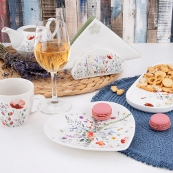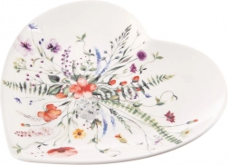 Denne porcelænstallerken i hjerteform fra Maki-kollektionen giver bordet et romantisk udtryk. Den hvide glasur med farverigt engblomster-dekor virker frisk og elegant, hvilket gør tallerkenen velegnet til både hverdag og festlig borddækning.