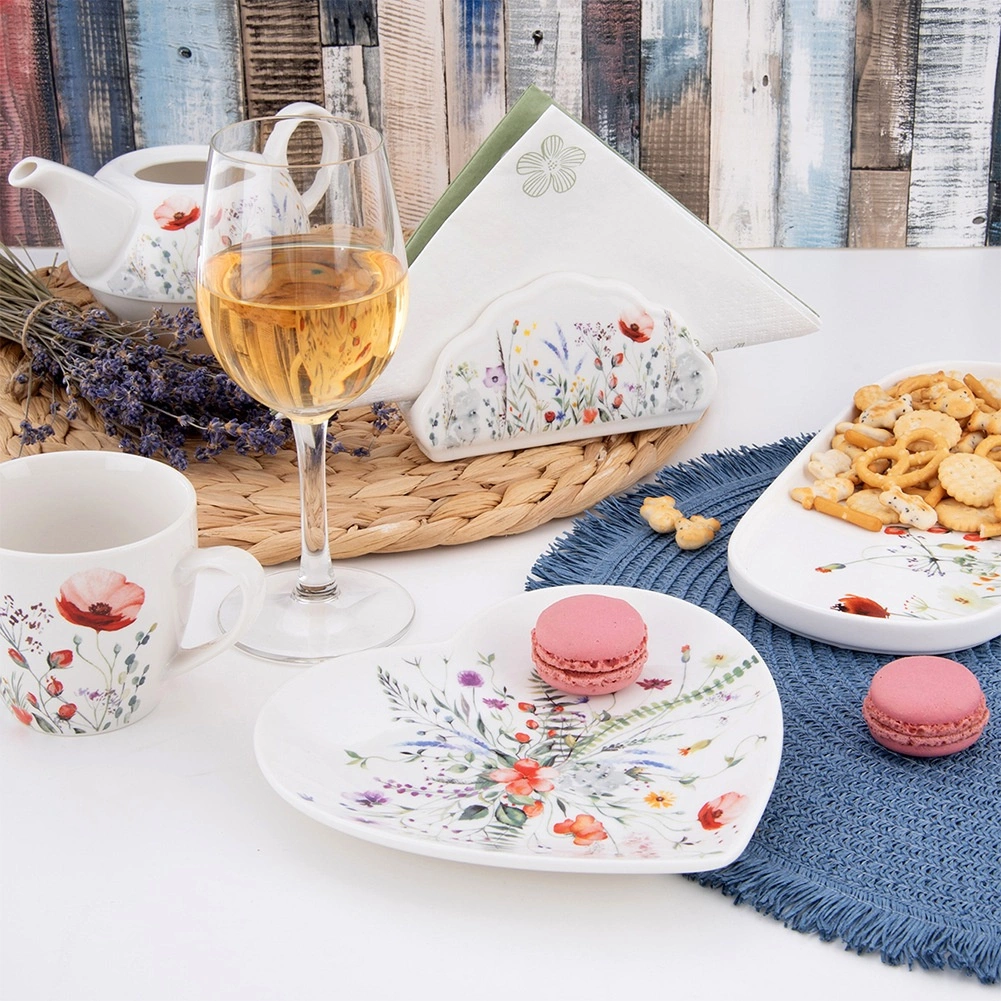 Hvid glasur og farverige engblomster skaber et friskt, elegant udtryk, der passer til både moderne og klassisk borddækning.