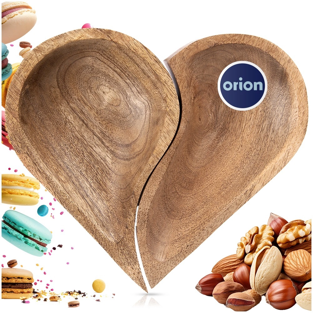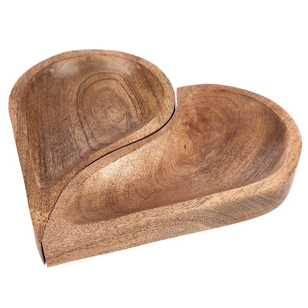 Stilfuldt sæt med to skåle af mangotræ, som danner en hjerteform, når de lægges sammen. Ideelle til servering af nødder, tørret frugt, slik eller små desserter. Takket være træets naturlige åretegning og den elegante form er sættet samtidig et dekorativt element til dit bord. Holdbart mangotræ, to separate dele for overskuelig servering og alsidig anvendelse i både køkken og stue.