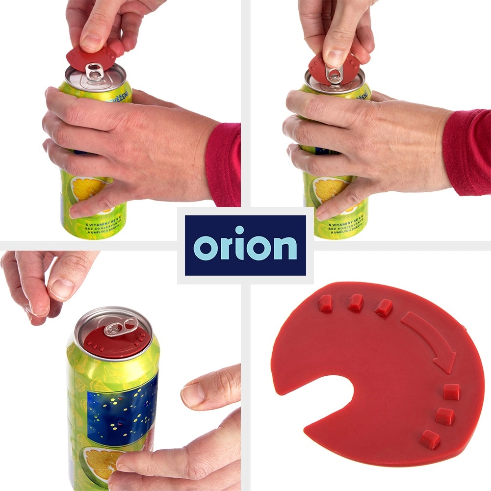 Sættet kombinerer åbner og låg i ét smart tilbehør. Plastdelen skubbes ind under tungen, og udskæringen støttes mod lågets midternit, hvilket gør det sikkert og komfortabelt at løfte fanen uden unødig kraft. Efter åbning drejes låget for at dække åbningen – låsen i udskæringen forankres ved midternitten, og kanten klikker i dåsens rullekant.