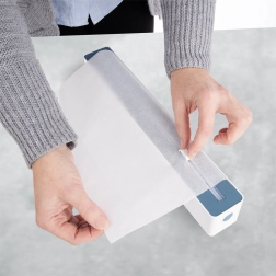 Dispenseren klarer både madfilm, aluminiumsfolie og bagepapir. Med de medfølgende sugekopper og dobbeltklæbende 3M-tape kan den monteres på glatte overflader uden boring, eller den kan nemt opbevares i en skuffe. Udskiftning af rullen tager sekunder – tryk på sideklemmerne, sæt rullen på holderne, og du kan skære.