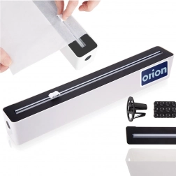 Den lange skinnesløber med en glideskær gør det muligt hurtigt og lige at skære film eller papir – sikkert og uden takkede kanter.
