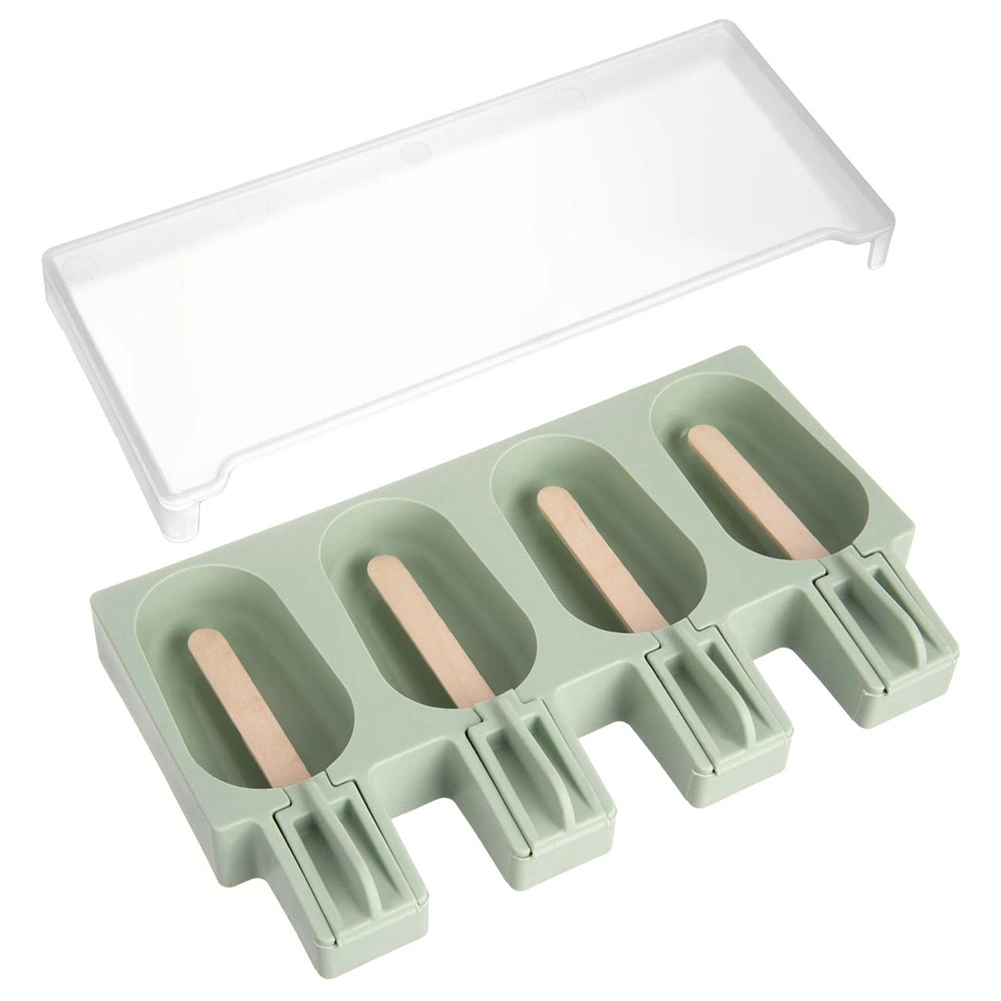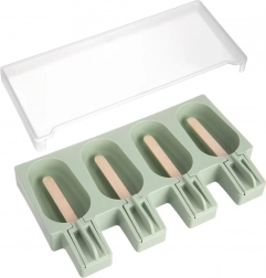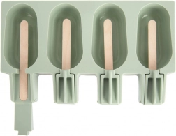 Formen er lavet af kvalitets-silikone i pastelgrøn, låget er gennemsigtigt. Den er egnet til opvaskemaskine, fryser og mikrobølgeovn og tåler temperaturer fra -20 °C til +120 °C. Pakken indeholder 24 stk. træpinde. Formens samlede mål er 20 × 11,5 × 2,6 cm, størrelsen på én ispind ca. 7 × 4 cm.
