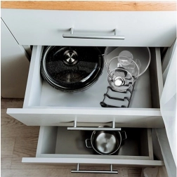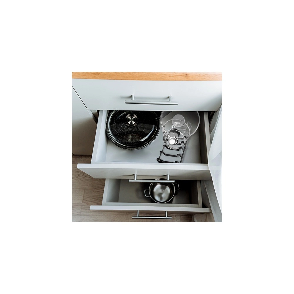 Velegnet til låg, tallerkener og skærebrætter. Fungerer perfekt på bordpladen, i skabet og i den dybe skuffe.