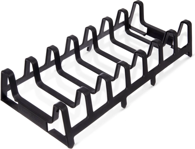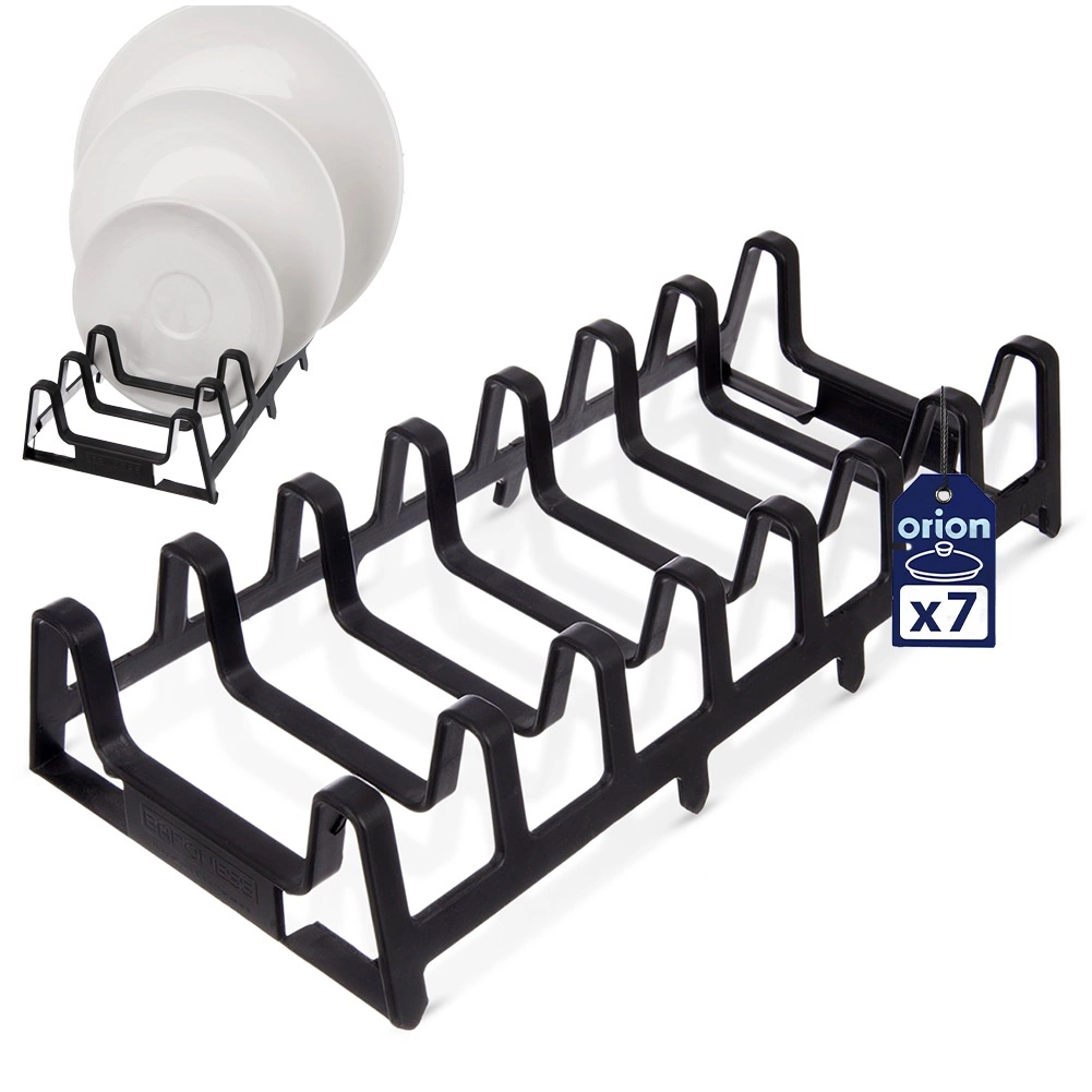 Farvel til løse låg og tallerkener. Dette alsidige stativ 30 × 14 × 6 cm holder alt sikkert på plads og pænt adskilt. Takket være de kompakte mål passer det til bordpladen, i skabet og i dybe skuffer. Det sorte design passer nemt ind i ethvert køkken.