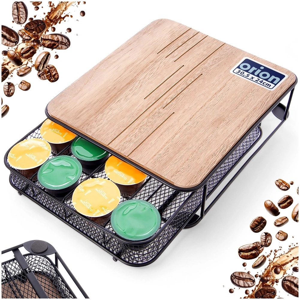 Hold styr på dine kapsler og spar plads på køkkenbordet. Organizeren kombinerer slidstærkt mat sort metal med en dekorativ træplade og passer perfekt i både moderne loft- og klassiske interiører. Skuffen med klar inddeling giver hurtig selektion af din yndlingskaffe og nem adgang.