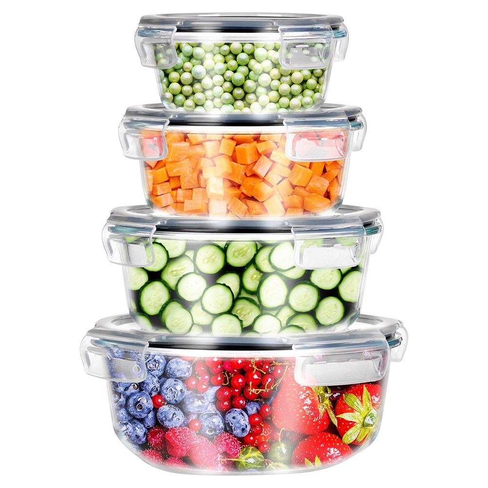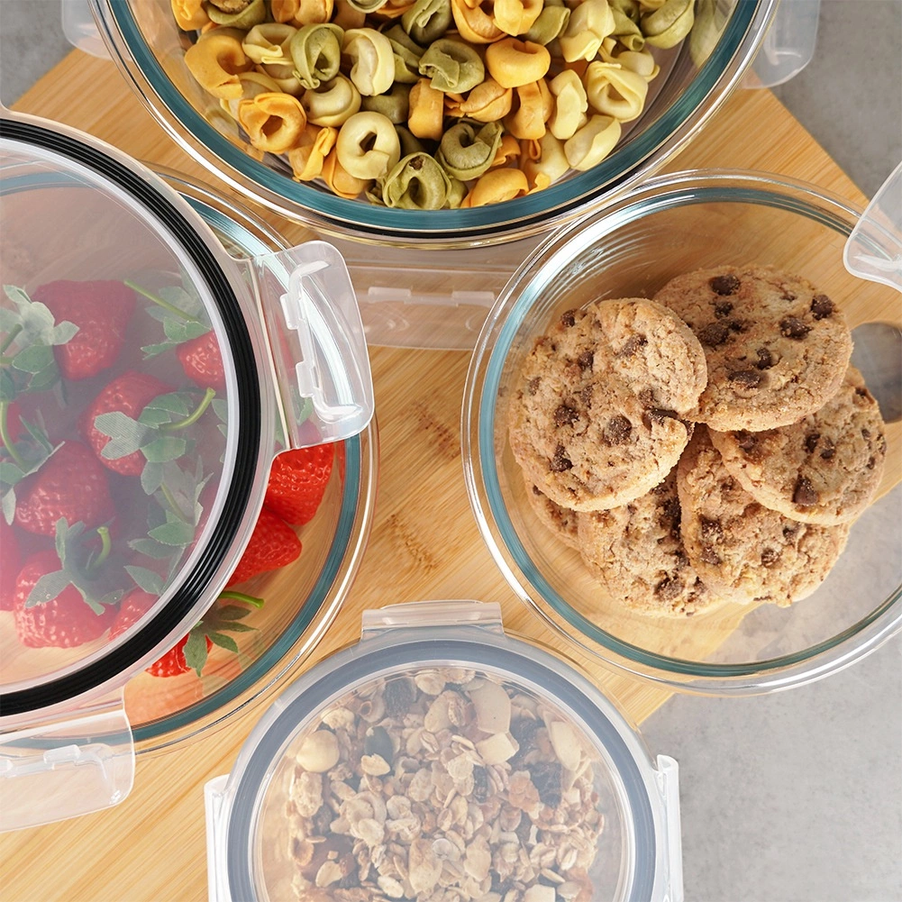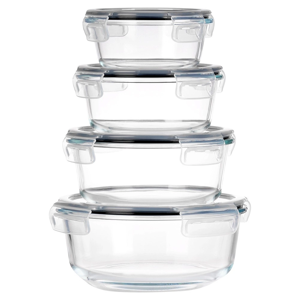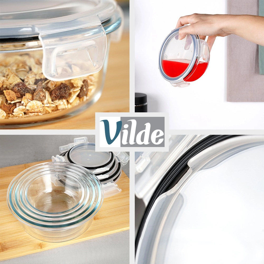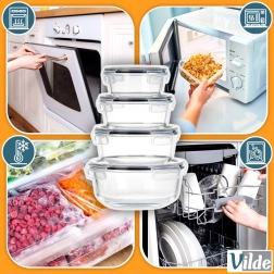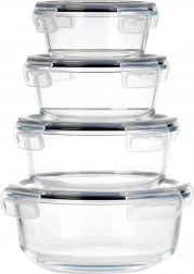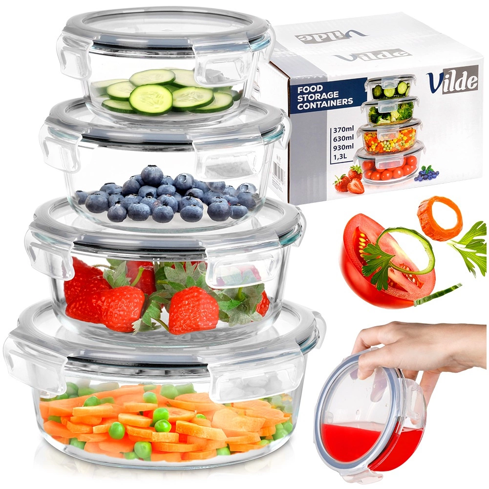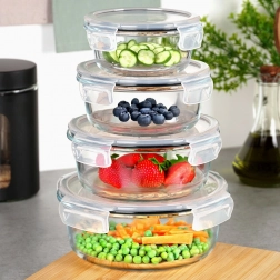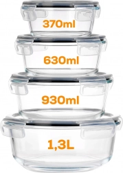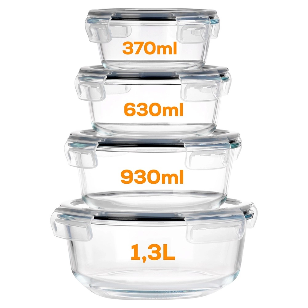 Sættet af glasdåser med fire sikre klips og silikonepakning holder dine fødevarer friske i længere tid og opbevaret sikkert. Det højkvalitets borosilikatglas er modstandsdygtigt over for temperaturschok og absorberer hverken lugte eller farver. Dåserne er ideelle til opbevaring, transport og servering.