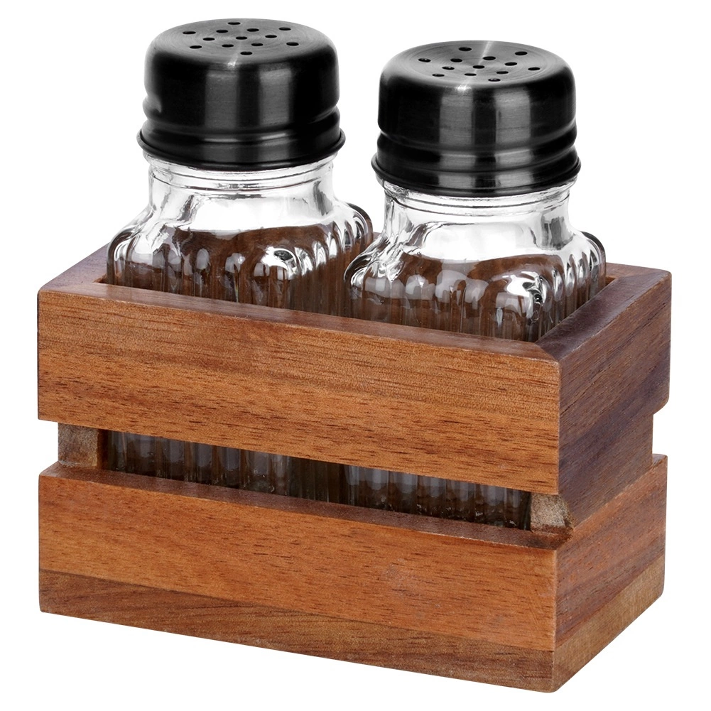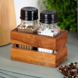 Dette 3-delte sæt kombinerer funktion og stil: to krydderibøsser i glas (til salt og peber) kompletteres af en kompakt holder i akacietræ, som gør både transport og organisering på bordet lettere. Riflet glas ligger godt i hånden, og det metalliske skruelåg med huller sikrer jævn strøning uden risiko for overdosering.