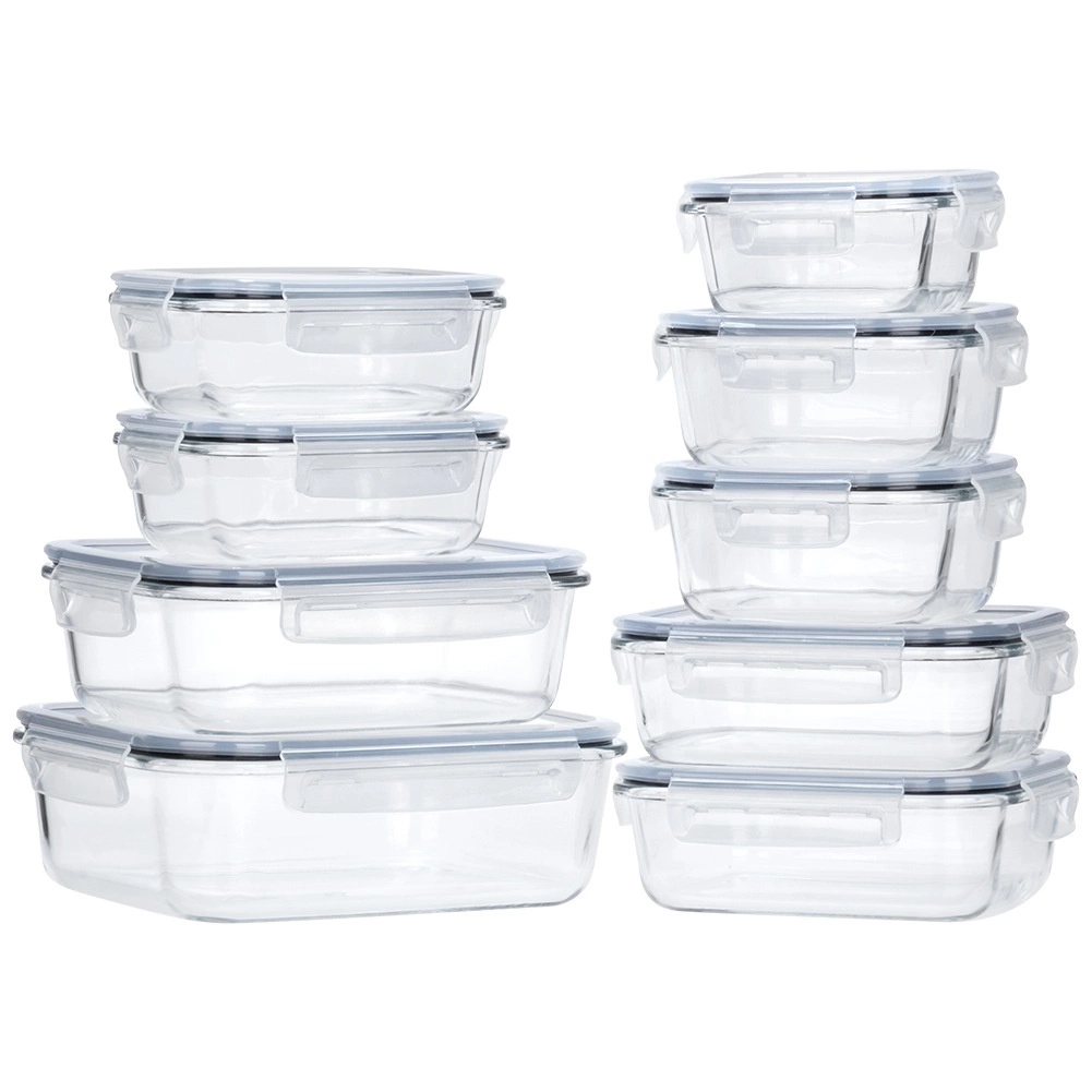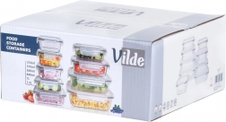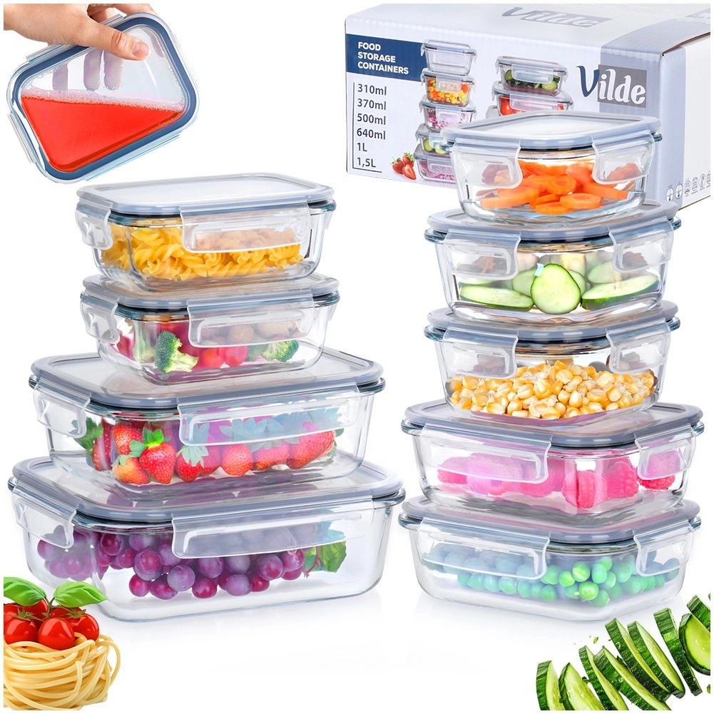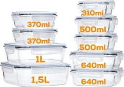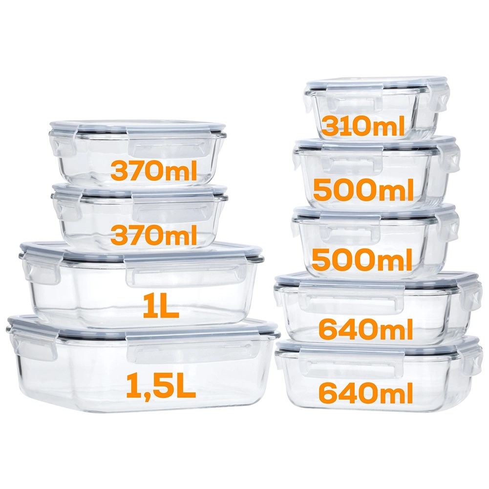 Sættet indeholder seks rektangulære og tre firkantede beholdere i forskellige størrelser, som kan sættes ind i hinanden for at spare plads. Det transparente glas giver hurtig kontrol af indholdet uden at åbne, og de solide låg med fire klips og silikonetætning sikrer tæt og hygiejnisk opbevaring.