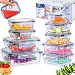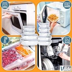 Alsidigt sæt med 9 glasbeholdere til mad med lufttæt låg og silikonetætning, som sikrer længere friskhed og orden i køkkenet. Det robuste borosilikatglas, de praktiske kliklåse og mulighed for brug i opvaskemaskine, mikroovn, ovn og fryser gør sættet ideelt til opbevaring, opvarmning og servering.