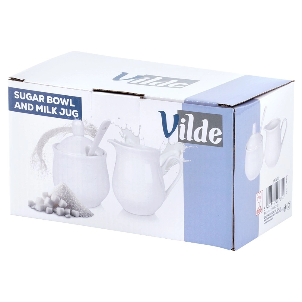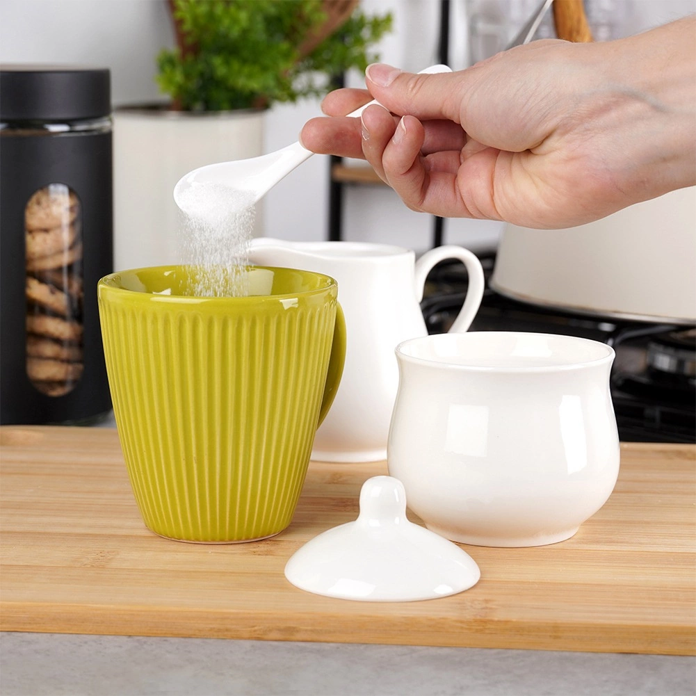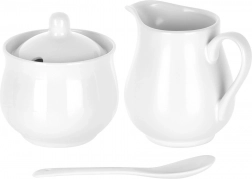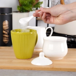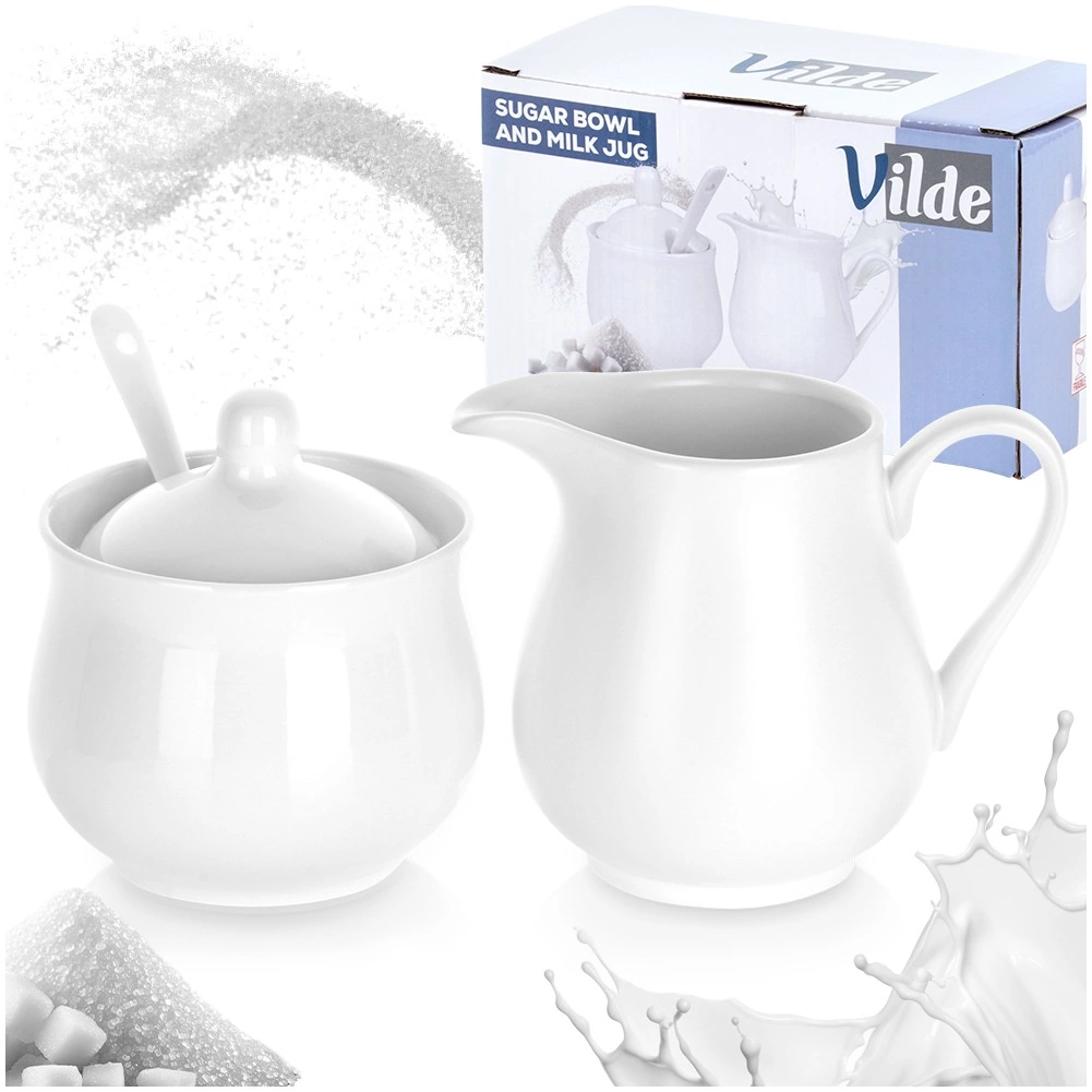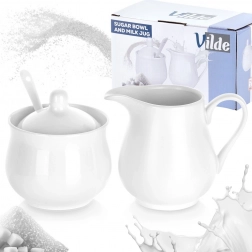 Dette designsæt kombinerer funktionalitet og det rene look fra porcelæn. Mælkekanden med ergonomisk håndtag og formet tud muliggør præcis ophældning af mælk eller fløde, og sukkerskålen med låg og praktisk udskæring til skeen holder sukkeret beskyttet og altid ved hånden. Den hvide farve passer nemt til enhver serviceserie og ser velplejet ud på ethvert bord.