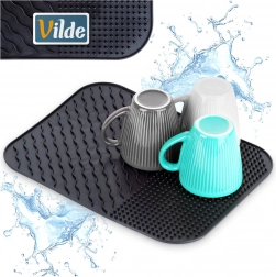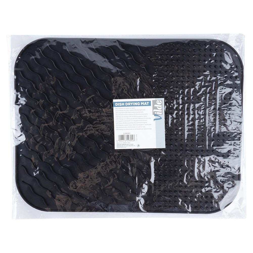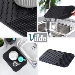 Elegant og funktionelt alternativ til et klassisk opvaskestativ. Silikonemåtten med målene 34 × 26,5 × 0,4 cm giver rigelig plads til tørring af service uden at optage meget plads. Det minimalistiske design i sort passer til ethvert køkken og holder bordpladen ren og overskuelig.