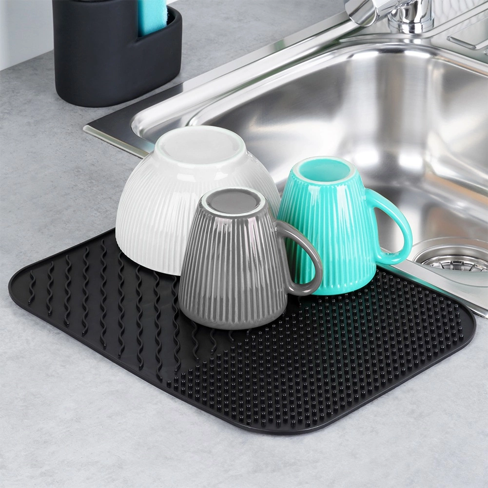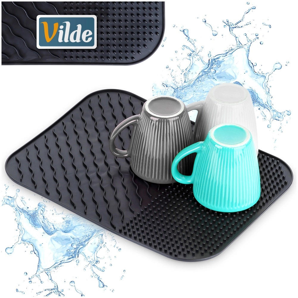 Praktisk silikonemåtte til tørring af service i elegant sort, som gør den daglige køkkenrengøring lettere. Den tilbyder stor overflade til tallerkener, glas og bestik, varmeresistens fra -40 °C til 120 °C og to retningsbestemte riller for hurtig afløb af vand. Den er nem at rengøre, holdbar og sparer plads på køkkenbordet.