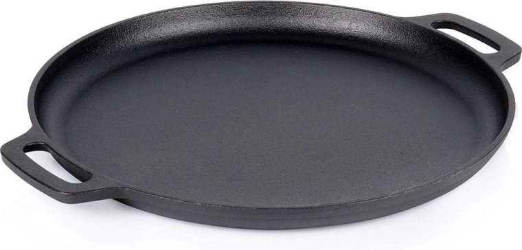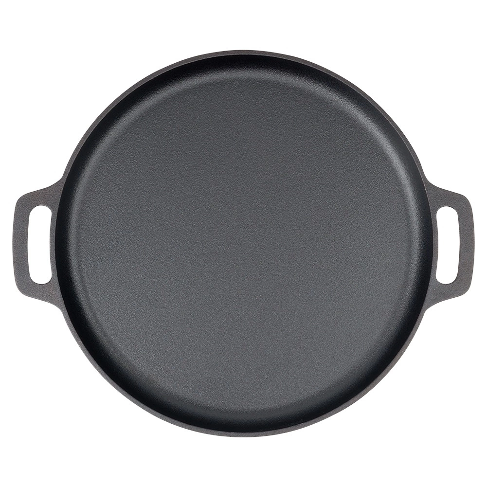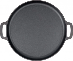 Denne massive støbejernspande er en alsidig hjælper til daglig madlavning derhjemme, på grillen og over åben ild. Takket være den store, flade overflade og lave kant er den perfekt til bøffer, æg, pandekager, tortillas, ovnbagte kartofler og pizza. To integrerede håndtag gør det sikkert at bære og servere direkte ved bordet.