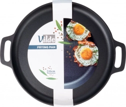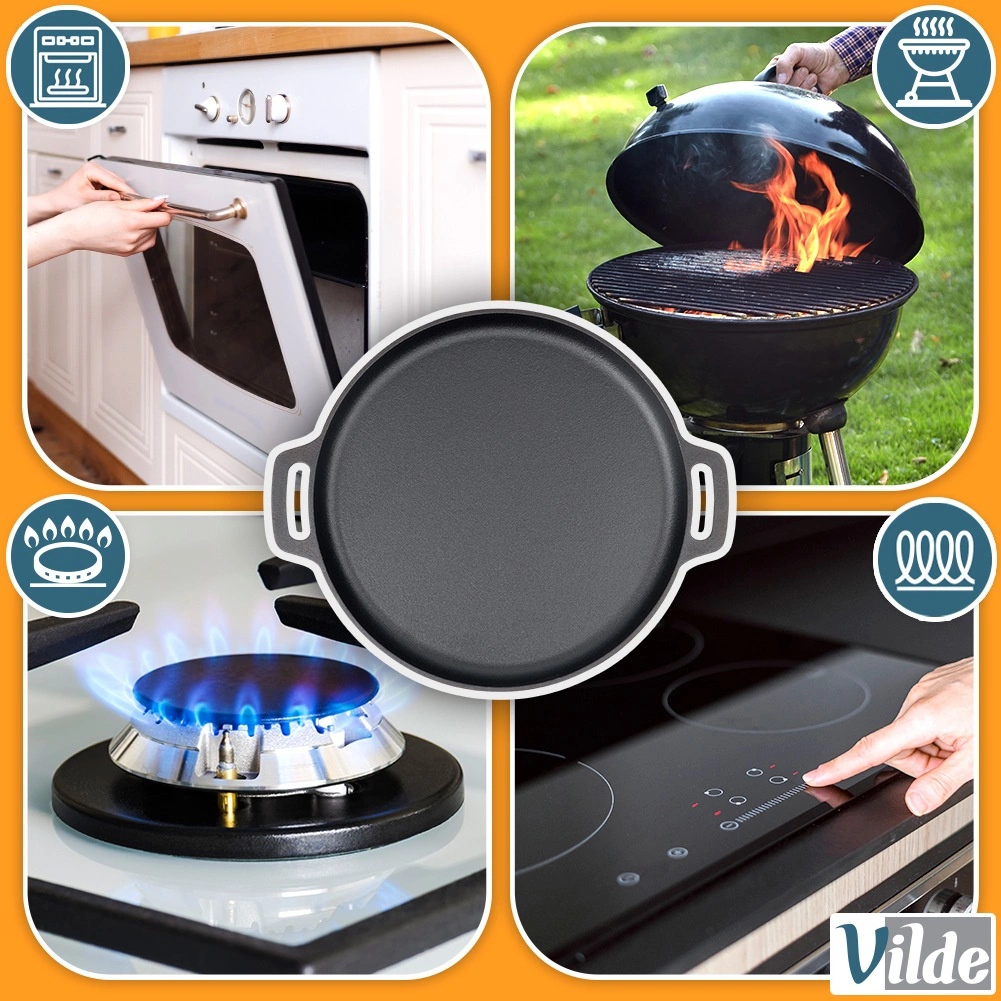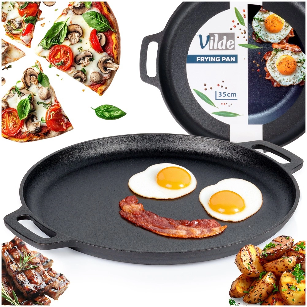 Robust rund støbejernspande med en diameter på 35 cm og to håndtag, ideel til stegning, bagning og sautering på komfur, grill og i ovn. Støbejern sikrer jævn varmefordeling og langvarig varmeholding, så dine bøffer, kartofler, pizza og grøntsager altid bliver perfekt tilberedt. Velegnet til gas, el, keramik, halogen og induktion. Dokumenteret kvalitet fra mærket VILDE i serien CAST LINE.