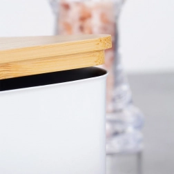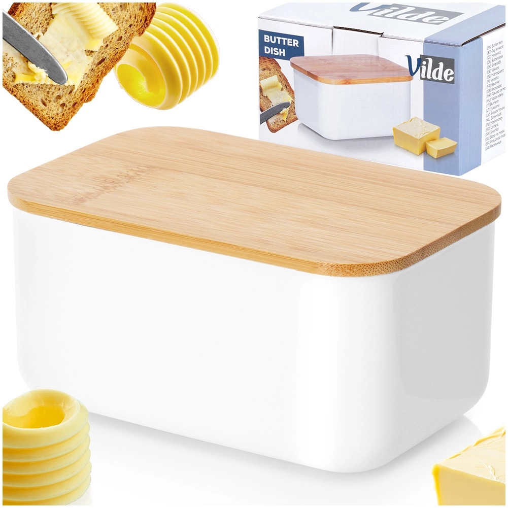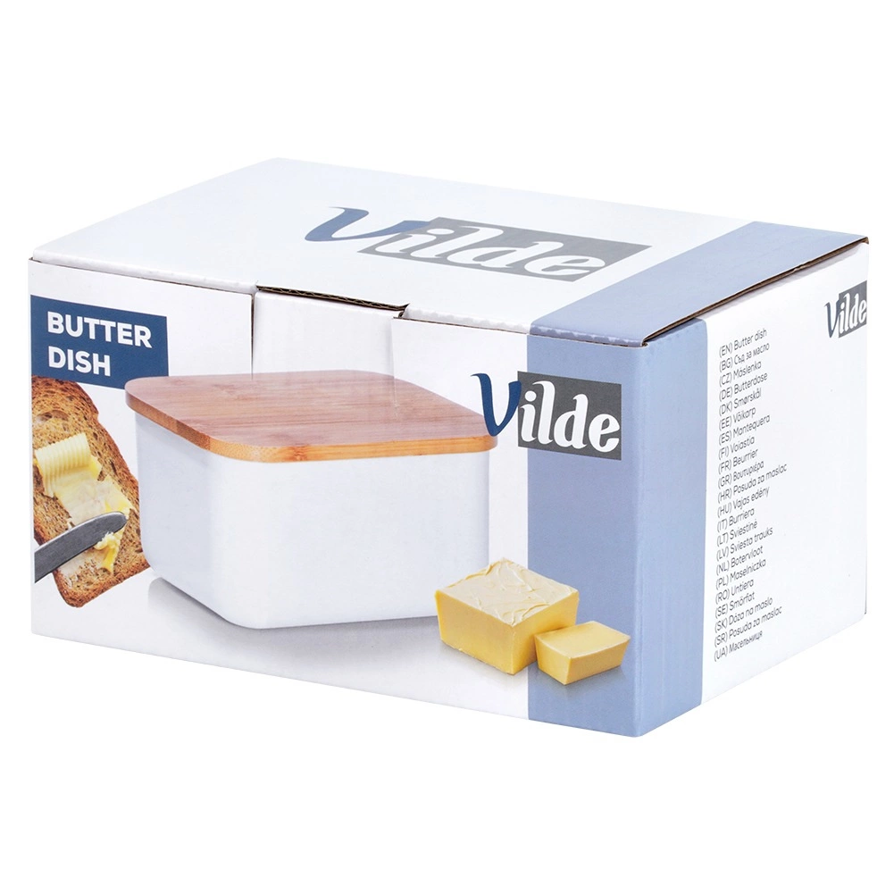 Denne praktiske smørboks er ideel til opbevaring af smør i køleskabet og til elegant servering på bordet. Solid stålkonstruktion med pulverlak i hvid og et naturbambuslåg giver et moderne og tidløst look, der passer til enhver borddækning.