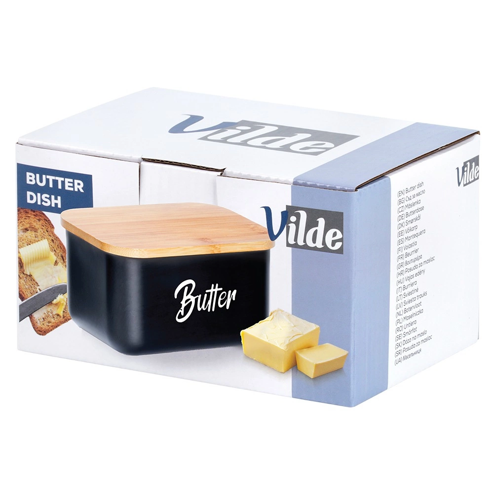 Mål 14,5 × 9,5 × 7,5 cm (højde uden låg 7 cm) giver rigelig plads til en standard smørpakke. Materialerne er fødevaresikre og lette at vedligeholde. Den klassiske form passer til enhver køkkenindretning og bordservering.