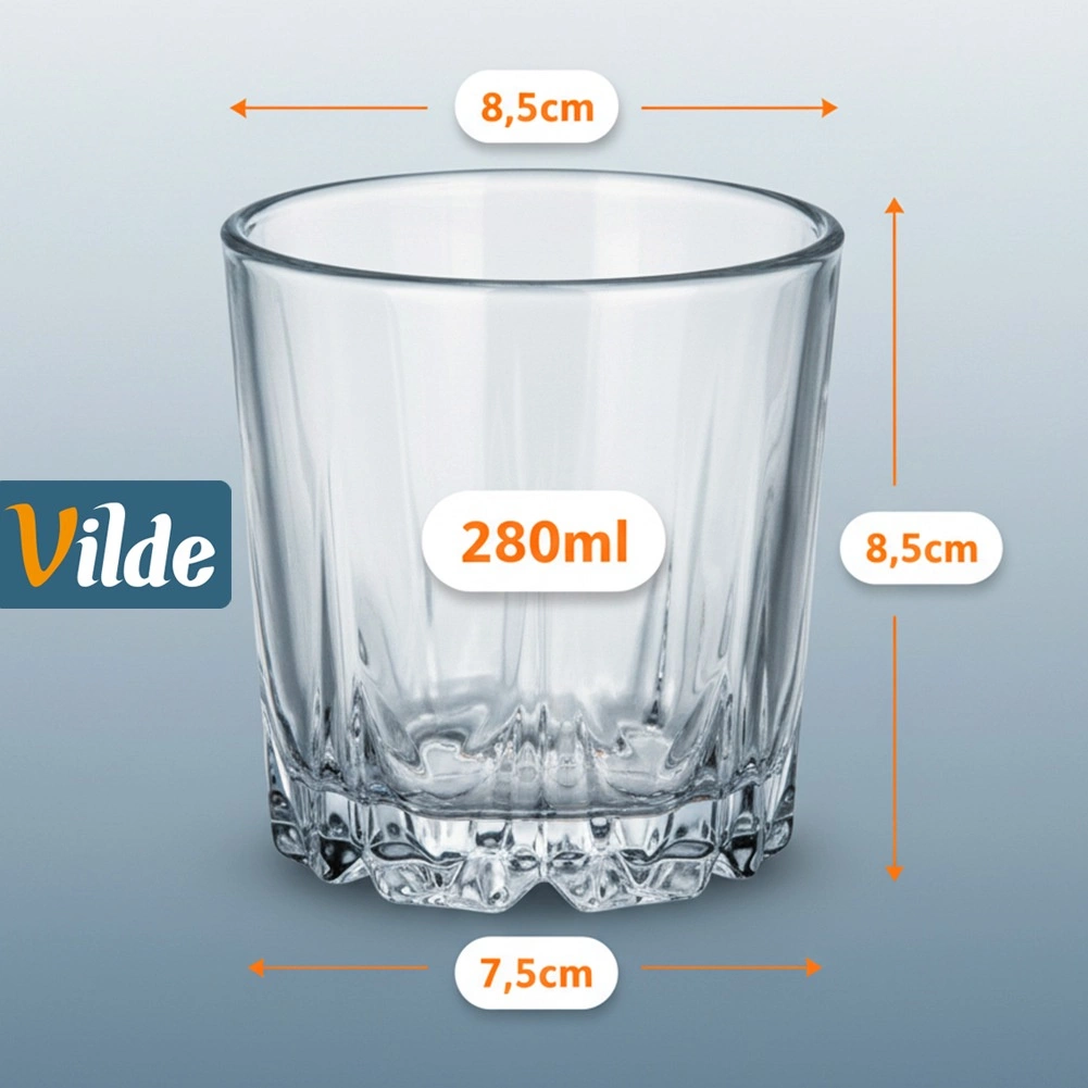 Elegante whiskyglas med en kapacitet på 280 ml i et sæt med 6 styk er fremstillet af kvalitets, kraftigt glas. De har en stabil, tyk bund, som hjælper med at holde drikken kold længere, samt alsidig anvendelse til whisky, cocktails, vand eller juice. De er egnet til opvaskemaskine og passer perfekt til både hjemme- og professionel brug.