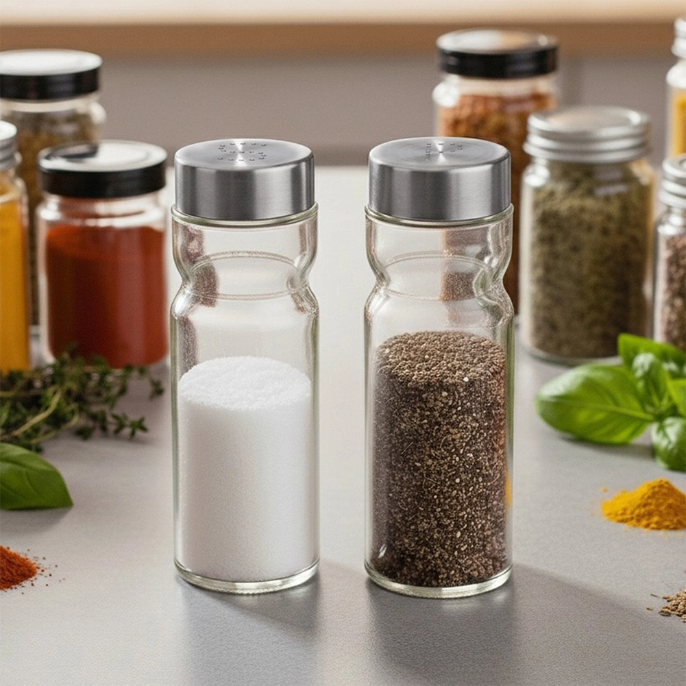 Tykt, gennemsigtigt glas og solide metallåg i elegant sølvfarvet udførelse kombinerer lang levetid med nem visuel kontrol af indholdet.