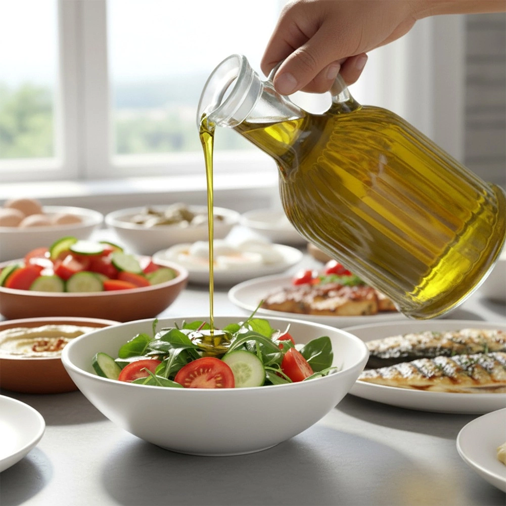 Takket være det ergonomiske håndtag og den formede hældetud hælder du uden dryp, mens korkproppen beskytter mod urenheder og hjælper med at bevare duft og smag. Velegnet til hjemmekøkkener, pizzeriaer og restauranter – en praktisk og samtidig dekorativ karaffel til bordet.