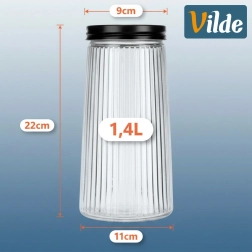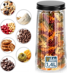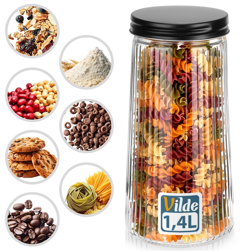 Denne praktiske og stilrene køkkendåse på 1,4 l hjælper dig med at holde spisekammeret organiseret og fødevarerne friske. Det højkvalitets borosilikatglas tåler temperaturændringer, og den riflede overflade giver et moderne look og et bedre greb. Det skruelige metallåg i sort sikrer tæt lukning og beskytter både aroma og sarte ingredienser.