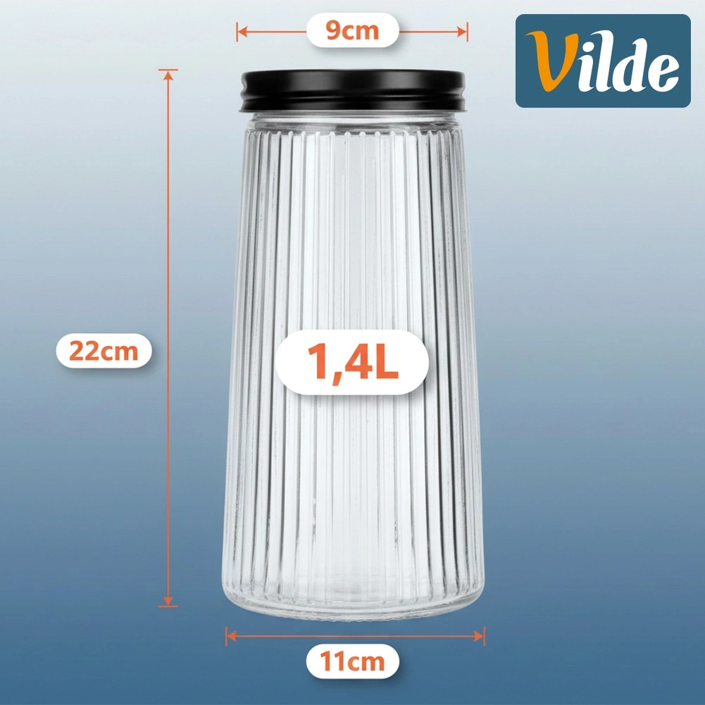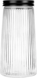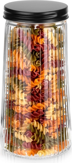 Elegant glasdåse med kapacitet på 1,4 l og sort skruelåg, som holder dine fødevarer friske længere. Den er fremstillet af robust borosilikatglas med dekorativ rifling, der sikrer både stilfuldt udseende og sikkert greb. Takket være den lufttætte lukning er den ideel til kaffe, pasta, mel, nødder eller mysli, og det gennemsigtige glas gør det let at se indholdet hurtigt.