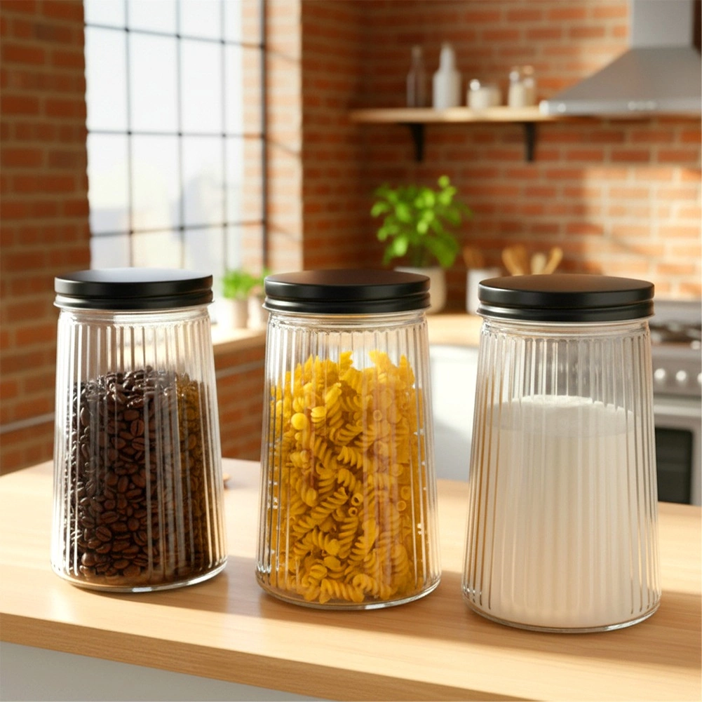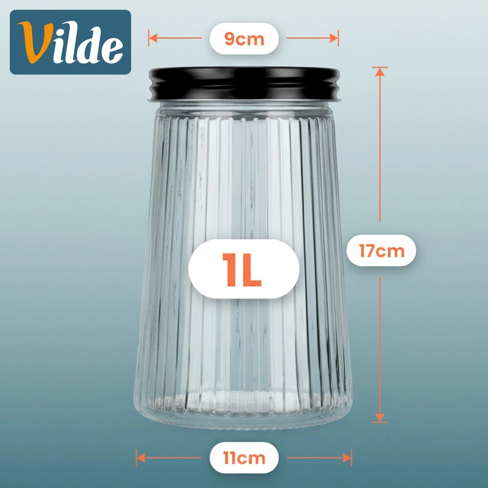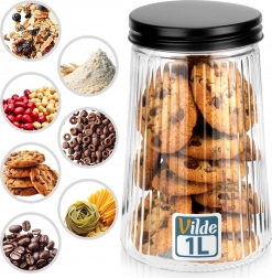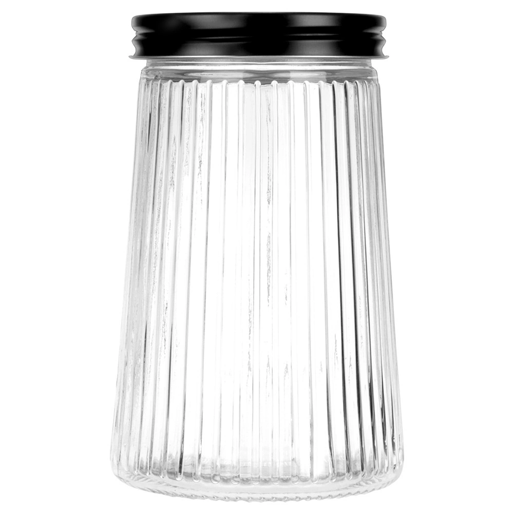 Praktisk glasbeholder med en kapacitet på 1 liter og skruelåg i metal holder dine madvarer friske længere og pænt organiserede. Fremstillet af holdbart borosilikatglas med et elegant riflet design, som gør det nemt at se indhold og mængde. Ideel til kaffe, pasta, sukker, nødder og andre tørre ingredienser.