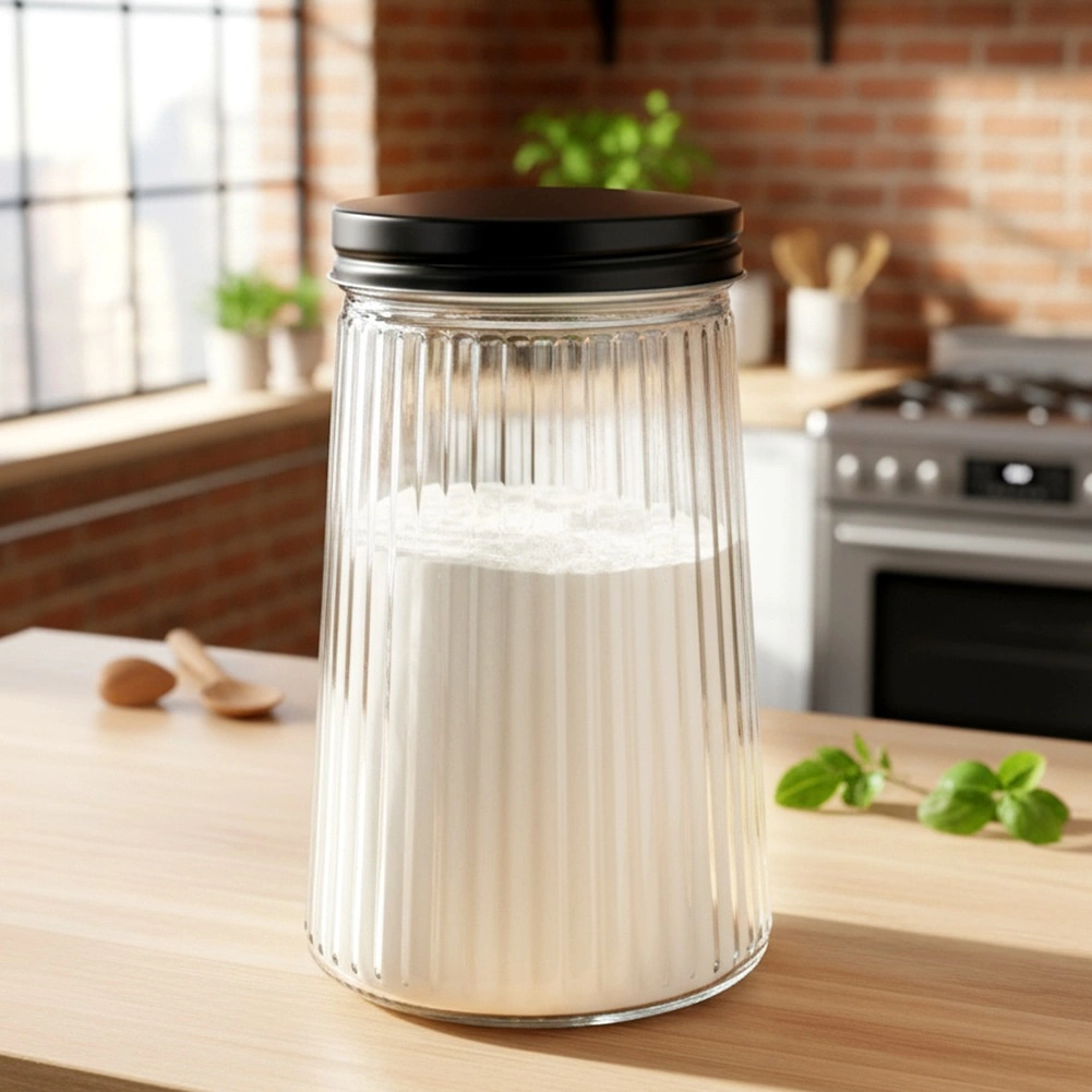 Det klare, riflede glas kombinerer stil og funktion – du ser nemt indholdet, og beholderen ligger godt i hånden.