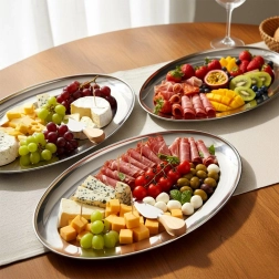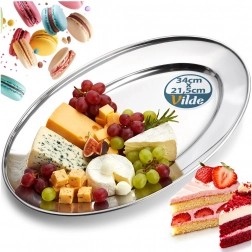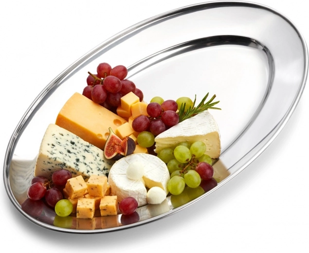 Stilfuldt ovalt serveringsfad i kvalitetsrustfrit stål med en blank, let rengørlig overflade og en praktisk kant for sikker transport. Et fremragende valg til hverdagsbrug såvel som festlige lejligheder – fra brunch til familieselskaber.