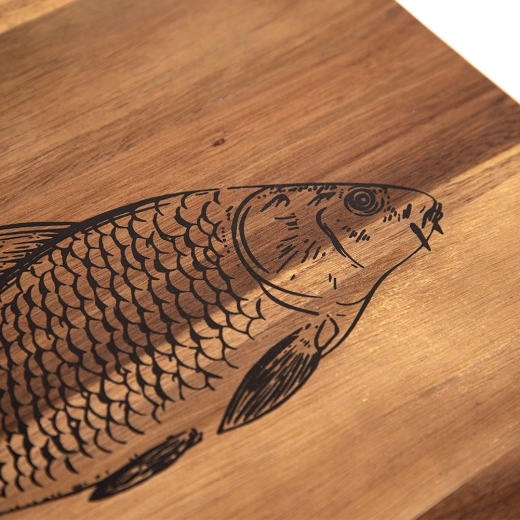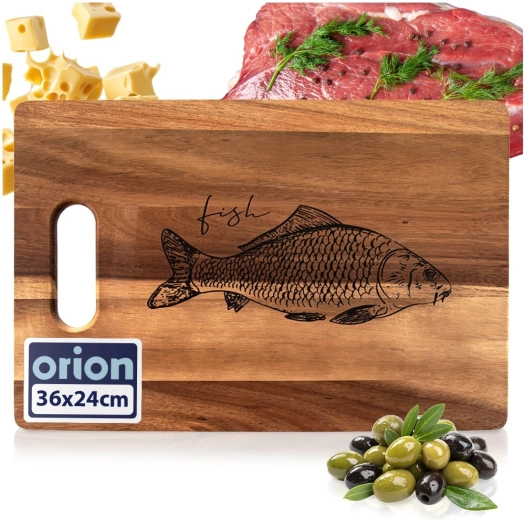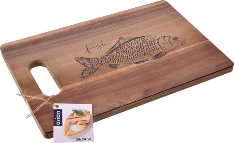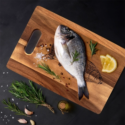 Praktisk og stilfuldt skærebræt i naturligt akacietræ med målene 36 × 24 cm og en tykkelse på 1,5 cm. Tilbyder høj holdbarhed, naturlig antibakteriel beskyttelse og nem transport takket være det ergonomiske håndtag. Det markante fiskemotiv og teksten “Fish” gør det nemt at bruge separat til fisk og skaldyr, hvilket hjælper med at opretholde hygiejne og undgå smagsblanding.