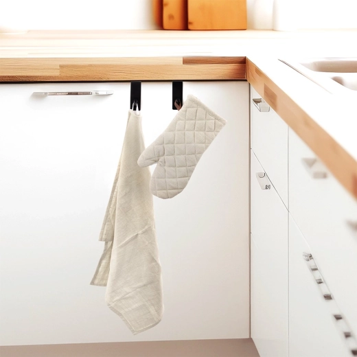 Sættet med to RADKA dørkroge gør det muligt effektivt at udnytte den ledige plads på døre, skabslåger eller brusekabiner. Det er nok blot at hænge dem på en kant med tykkelse op til 2 cm, og du får straks plads til håndklæder, viskestykker, badekåber eller let tøj. Metalkonstruktionen i elegant sort sikrer lang levetid og holdbarhed.