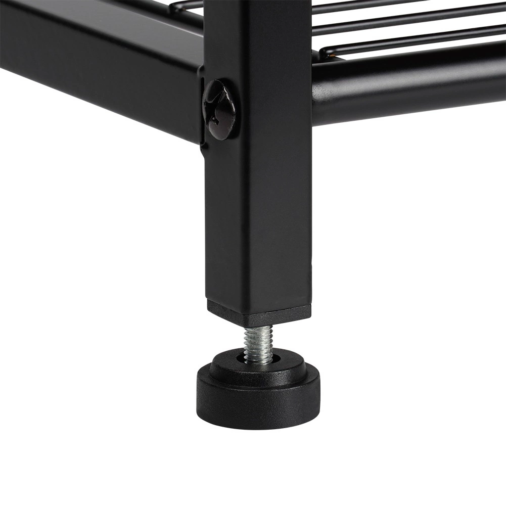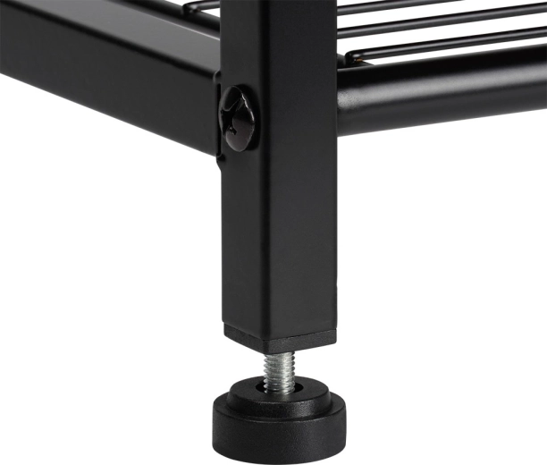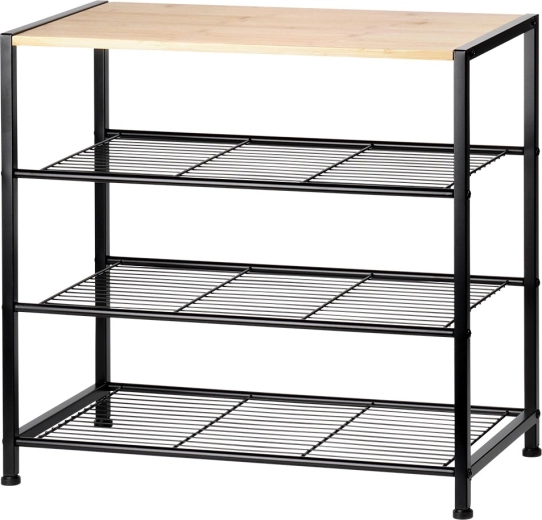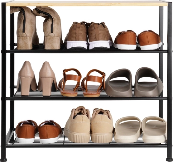 Denne skoreol med fire niveauer er den ideelle løsning til organisering af fodtøj i enhver husstand. Metalkonstruktionen med sort pulverlakeret overflade sikrer holdbarhed og stabilitet, mens den bambus topplade giver plads til tasker, nøgler og andre småting. Takket være de gennemtænkte mål passer den også i mindre rum og holder dine sko pænt samlet ét sted.