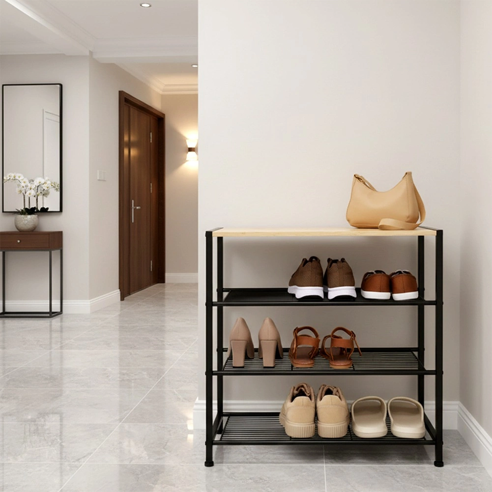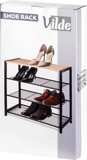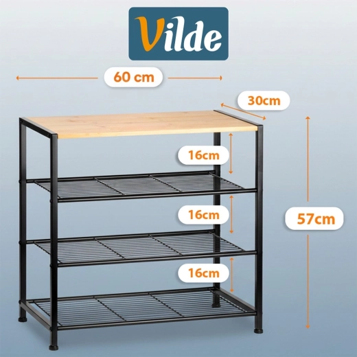 Praktisk og stabil skoreol i kompakte mål 60 × 30 × 57 cm med 4 niveauer til overskuelig opbevaring af sko og en bambus topplade til tilbehør. Takket være den robuste metalkonstruktion med sort pulverlak får du orden, pladsbesparelse og et stilfuldt element til entré, garderobe eller garage. Rummer cirka 9–12 par sko afhængigt af størrelse og placering.