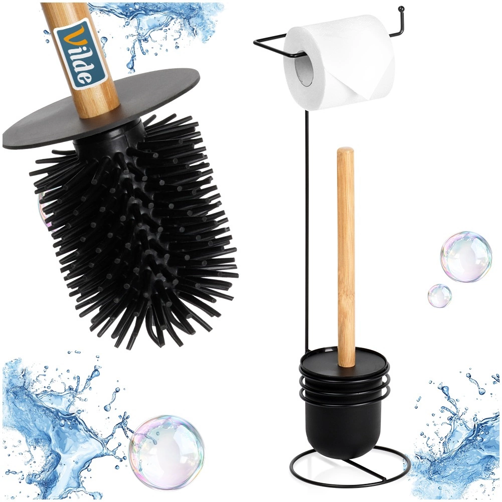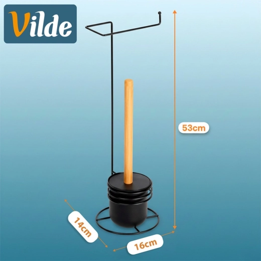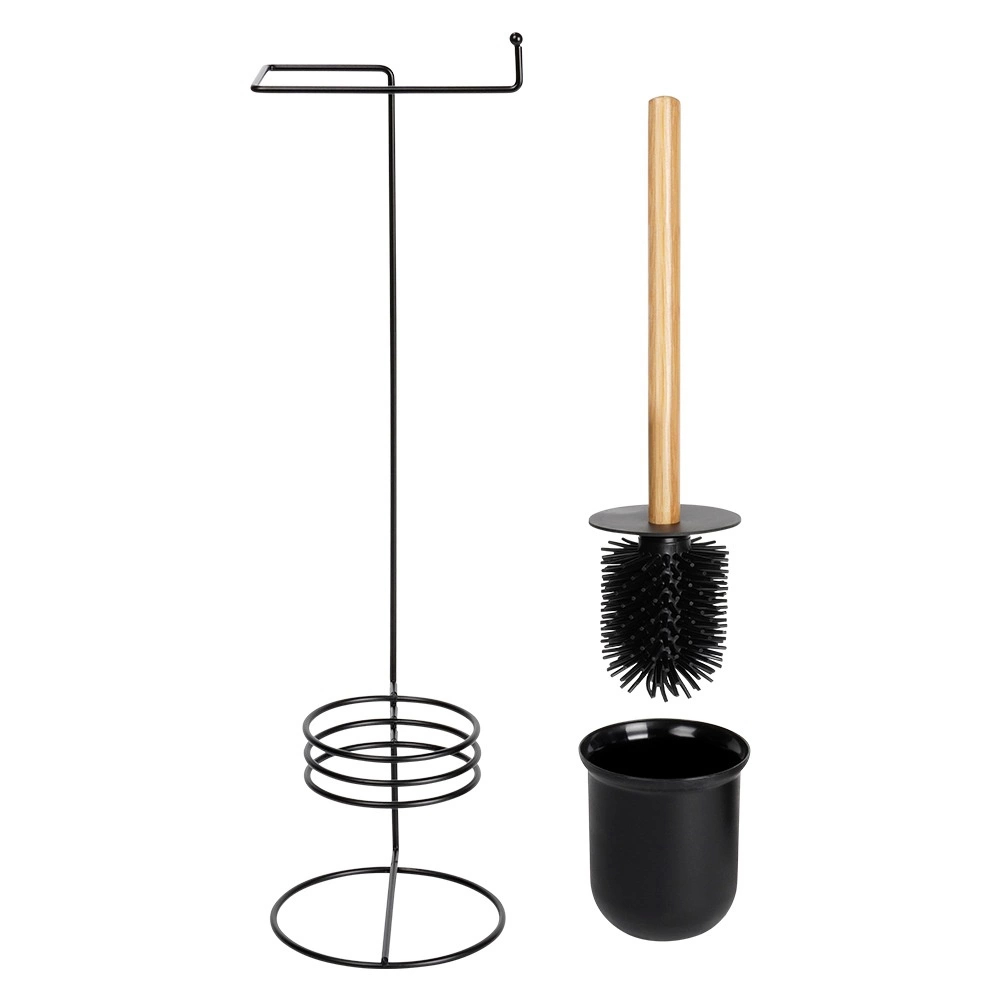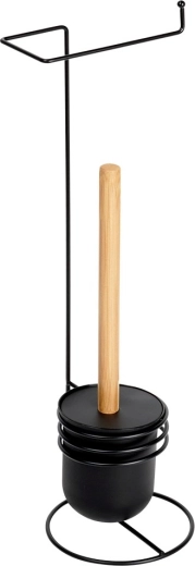 Hold badeværelset ryddeligt og stilfuldt med den multifunktionelle stander, som giver bekvem adgang til toiletrullen og hygiejnisk opbevaring af toiletbørsten. Det minimalistiske design i sort med bambusdetaljer passer perfekt til både moderne og klassiske interiører og sparer samtidig plads.