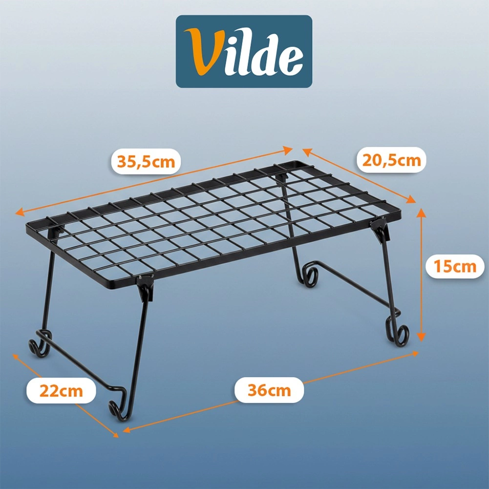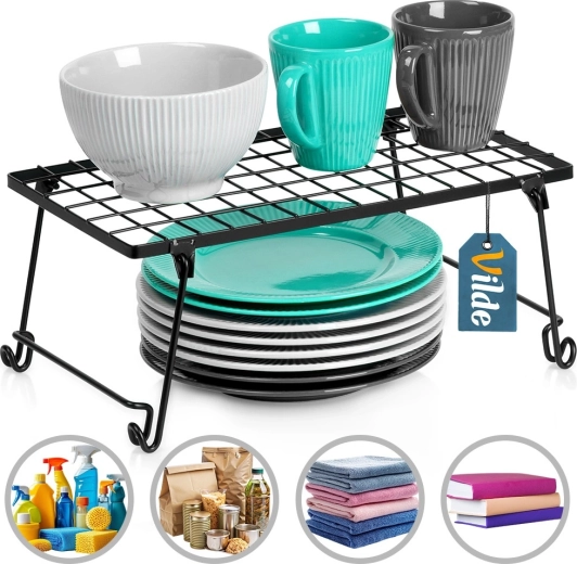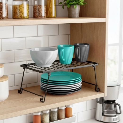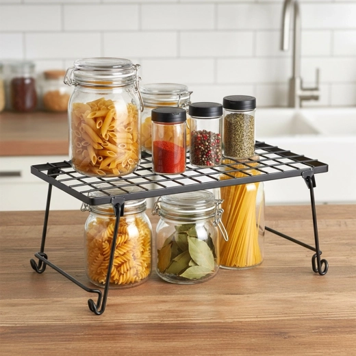 Denne alsidige køkkenhylde i kvalitetsmetal i elegant sort er en fremragende løsning til overskuelig opbevaring af service og tilbehør. Den opdeler skabets indre eller bordpladen i to sektioner og muliggør maksimal udnyttelse af højden.