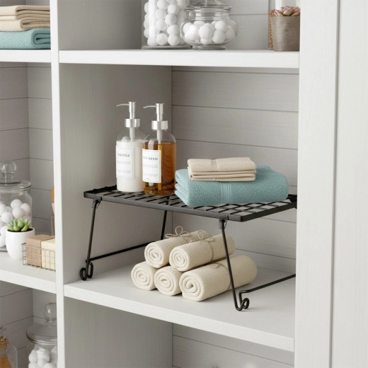 - Pladsbesparende – deler skab eller hylde praktisk i to niveauer.