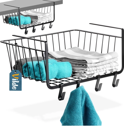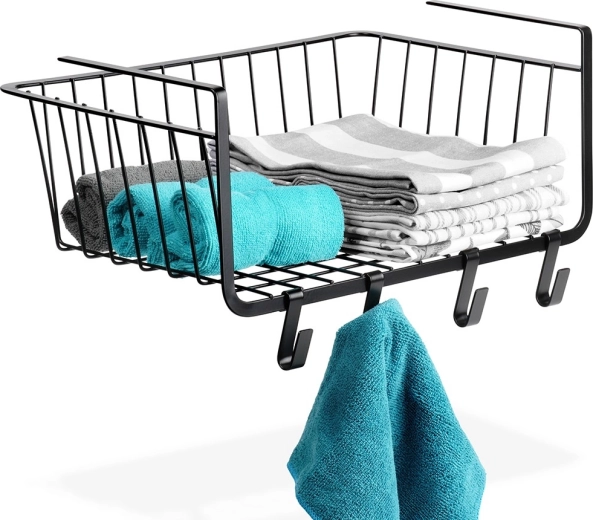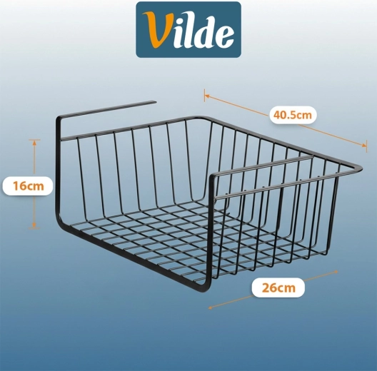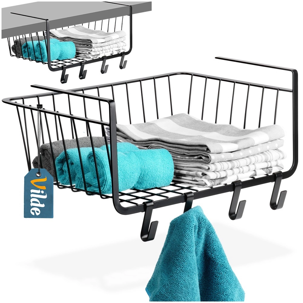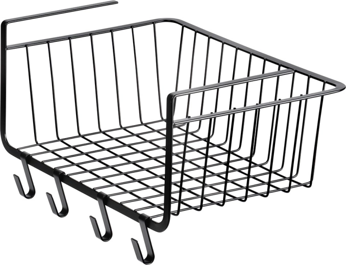Praktisk hængende kurv under hylde med målene 40,5 × 26 × 16 cm udvider opbevaringspladsen uden boring. Inkluderer fire kroge til ophæng af viskestykker eller tilbehør. Kurven er lavet af holdbart metal i sort farve, har alsidig anvendelse i køkken, badeværelse, garderobe og kontor og muliggør hurtig installation uden værktøj.