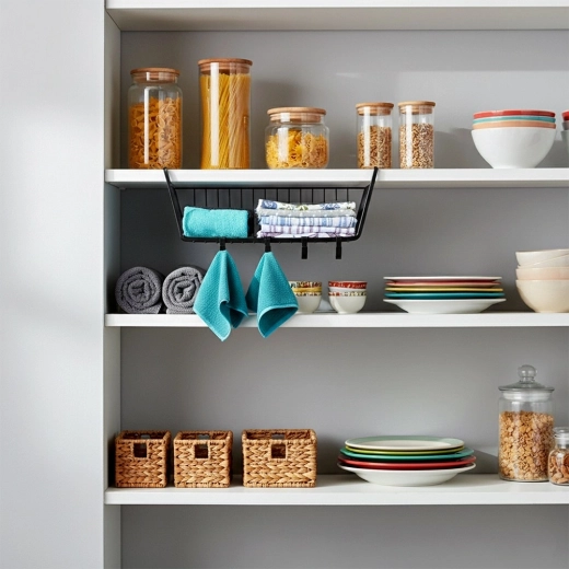 Organisér hjemmet smart og uden at bore. Den hængende kurv skubbes nemt ind under en hylde eller på et skabsreling, så du straks får ekstra opbevaringsplads til overskuelig opbevaring af køkkenudstyr, badeværelsestilbehør eller tekstiler. Pakken indeholder 4 praktiske kroge til ophæng af viskestykker, grydelapper eller små accessories.