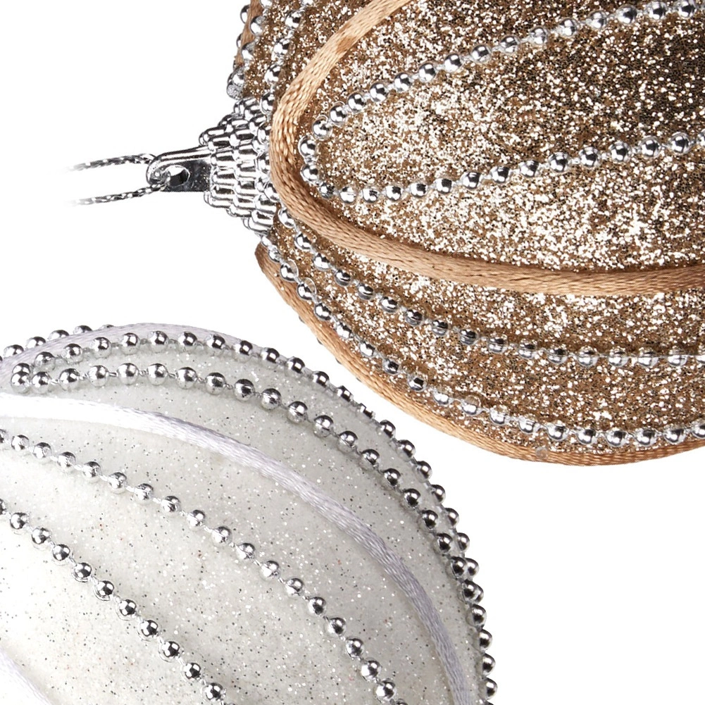Elegant sæt julepynt, der giver din dekoration et luksuriøst præg. Indeholder 12 uknuselige kugler med en diameter på 8 cm i hvid og champagneguld. Hver kugle er dekoreret med glitrende brokade, dekorative perler og en snor til øjeblikkelig ophængning. Takket være udførelsen i styropor er pyntet sikker og modstandsdygtig over for brud – ideel i hjem med børn og kæledyr.