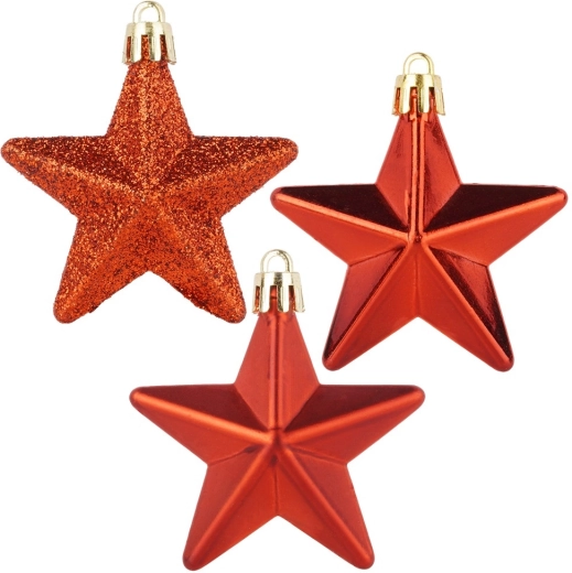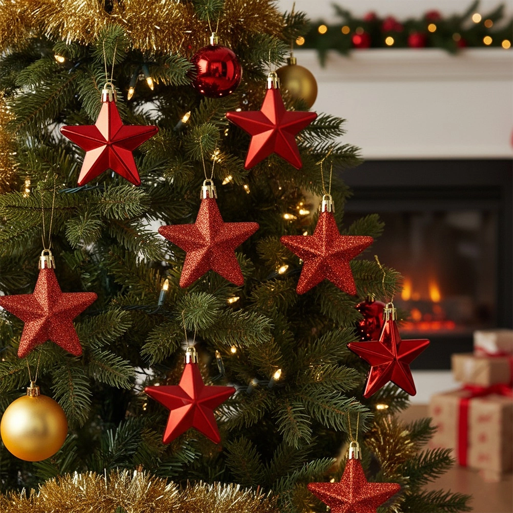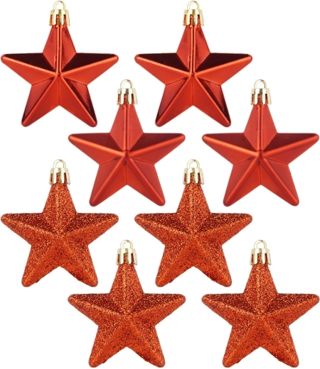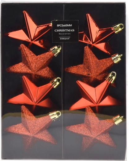 Det elegante sæt indeholder 8 røde stjerneornamenter med en diameter på 6,5 cm i blank, mat og glitrende udførelse. Takket være det robuste materiale er de uknuselige, sikre for børn og kæledyr og ideelle til juletræet, kranse eller festlige dekorationer. Ophængssnore er inkluderet i pakken.
