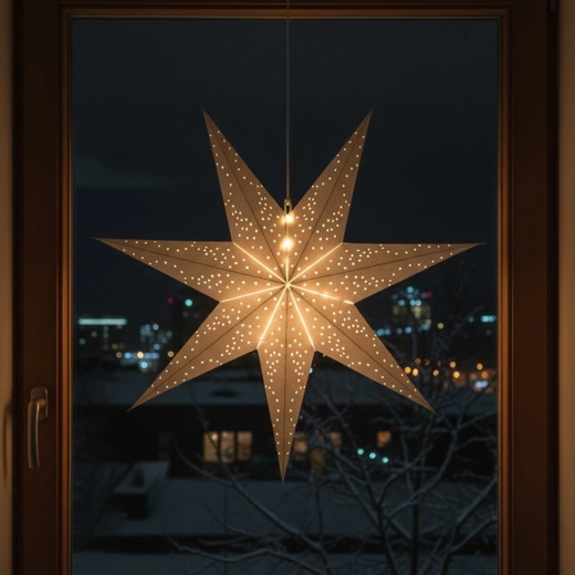 Stjernen er lavet af solidt papir med FSC-certificering, hvilket garanterer ansvarligt materialeoprindelse. Alligevel er den let og nem at hænge op, og fylder minimalt, når den foldes sammen. I kombination med en lille LED-lyskæde (medfølger ikke) skaber den en magisk vinterstemning – ikke kun til jul.