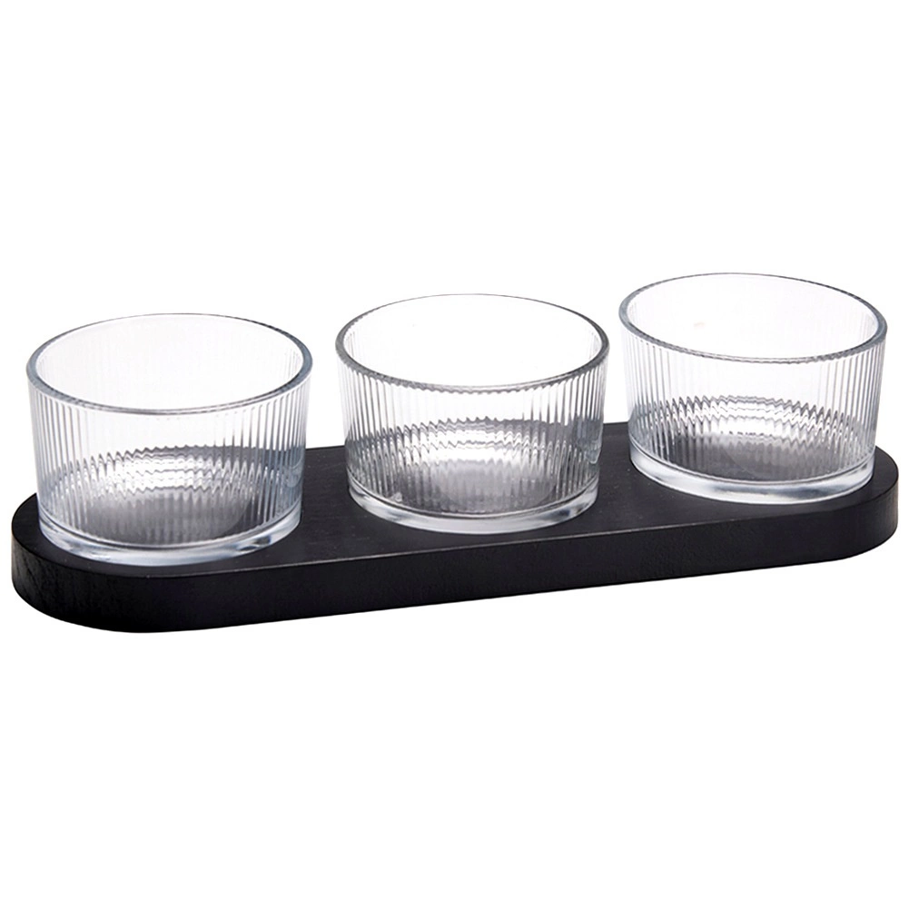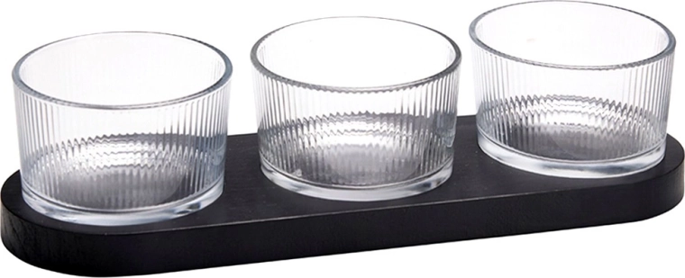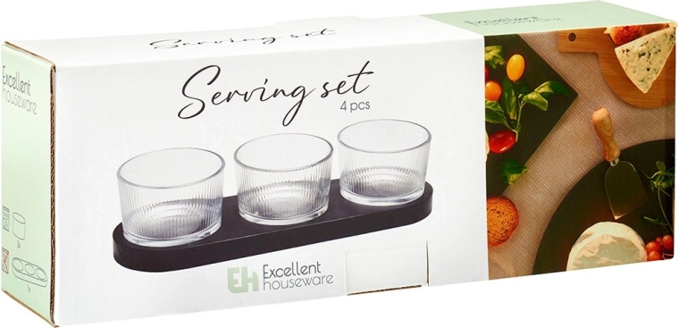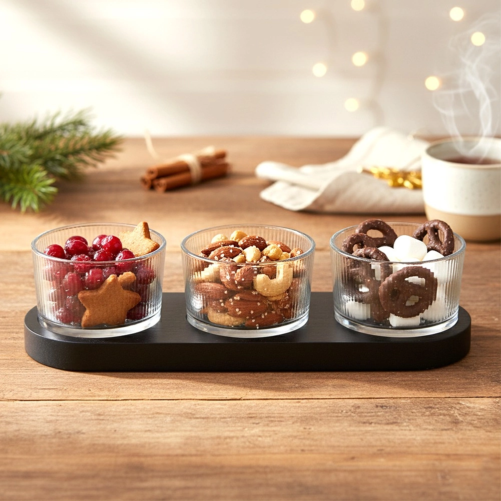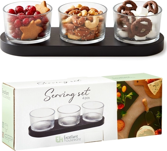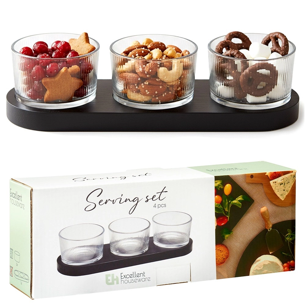 Elegant 4-delt sæt til servering af snacks, der kombinerer tre glasskåle og en rektangulær træbakke i sort. Ideel til dips, oliven, nødder og antipasti. Moderne design med riflet glas og praktiske fordybninger for stabilitet sikrer nem og stilfuld servering.