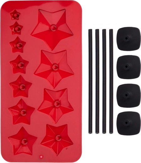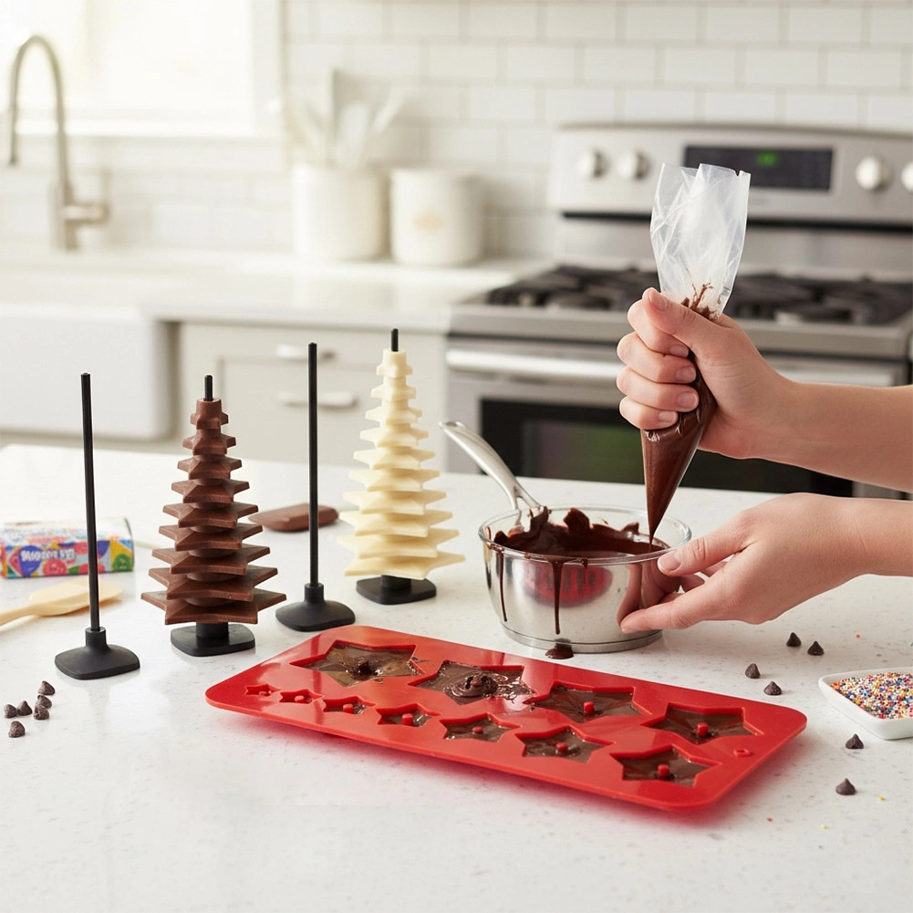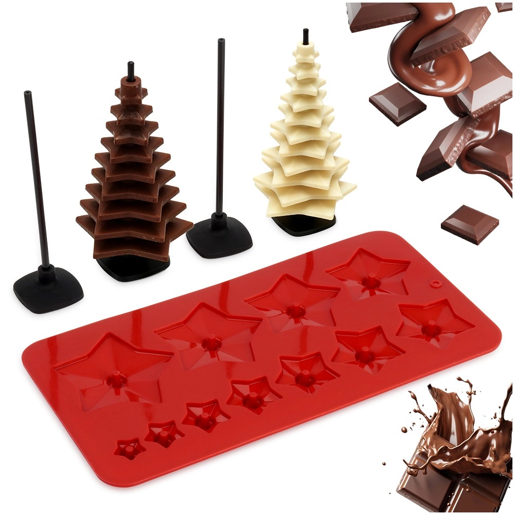 Sættet indeholder en form til 11 stjerner i forskellige størrelser, 4 pinde (15 cm) som træets midte og 4 stabile silikonebaser. Sæt stjernerne på fra den største til den mindste for at skabe et effektfuldt chokoladetræ – ideelt til festlig udsmykning og spiselige gaver.