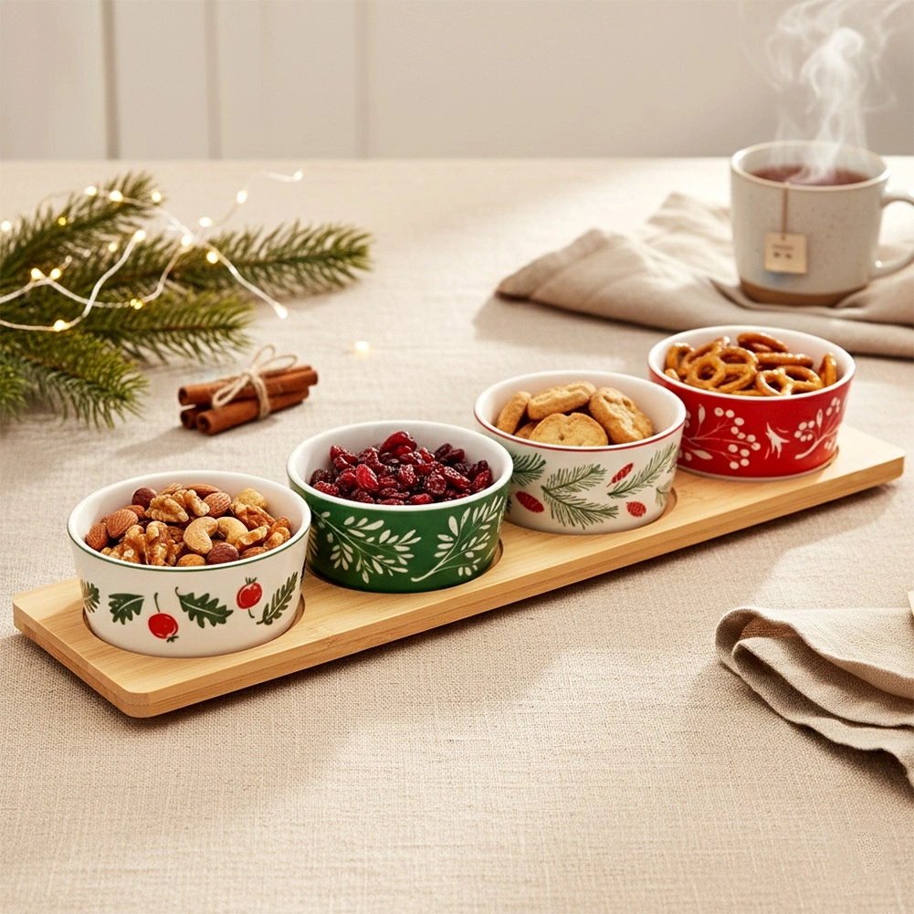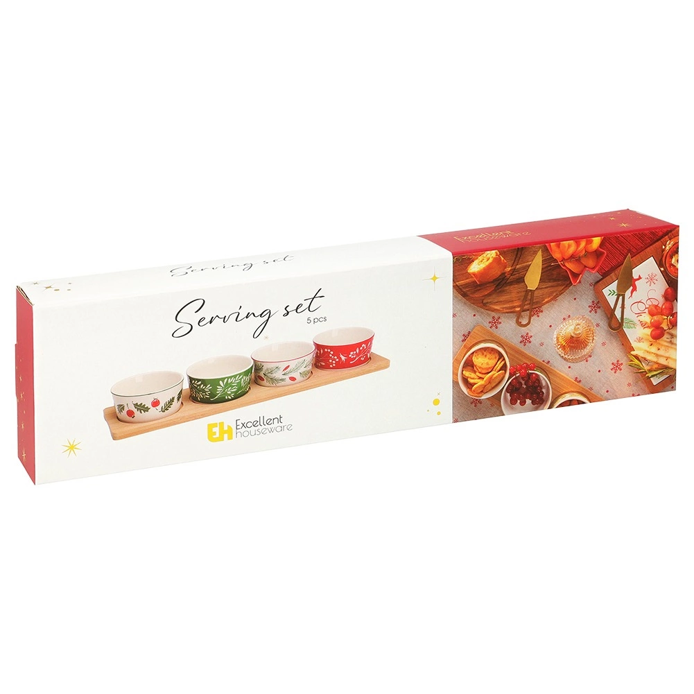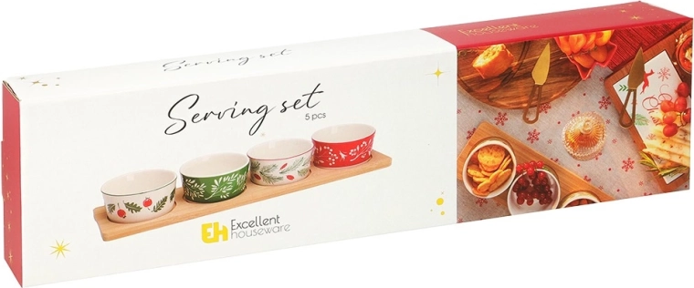 Stilfuldt serveringssæt med en bambusbakke og 4 porcelænsskåle med julemotiver. Ideelt til nødder, oliven, dips og små snacks under hyggelige sammenkomster. Præcise fordybninger i bakken forhindrer, at skålene glider, og porcelænsskålene kan tåle opvaskemaskine. Bakke 38 × 10 × 4,5 cm, skål 8,5 × 4 cm, volumen 140 ml.