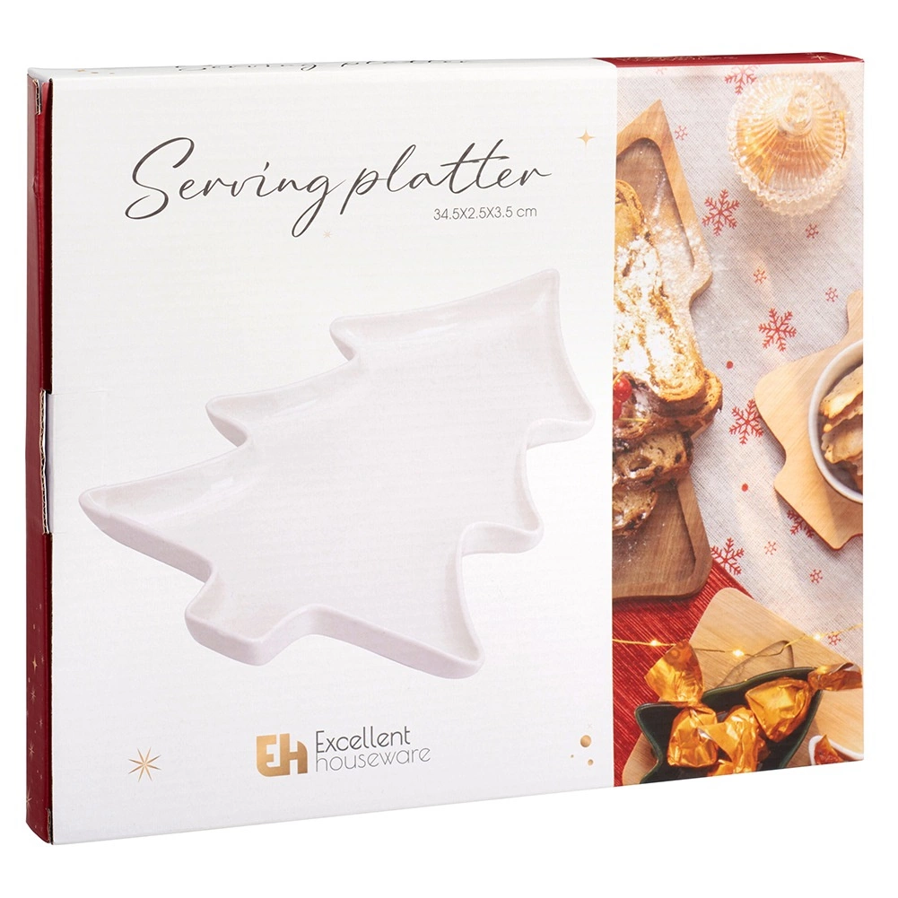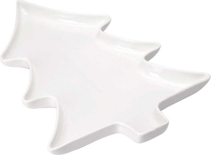 Elegant porcelænsfad formet som et juletræ med målene 35 × 26 × 3 cm, ideelt til stilfuld servering. Højkvalitets hvid porcelæn, rigelig overflade og let forhøjet kant for sikker servering af oste, pålæg, frugt eller desserter. Tåler opvaskemaskine og mikroovn, perfekt til det festlige bord.
