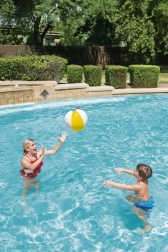 Den flerfarvede strandbold fra BESTWAY er ideel til vandlege, ferie ved havet og weekenden i haven. Dens tydelige paneler i rød, blå, gul og hvid er lette at se i vandet og understreger den tidløse sommerstil. Et godt valg for familier, der søger sjov, bevægelse og fælles stunder.