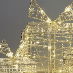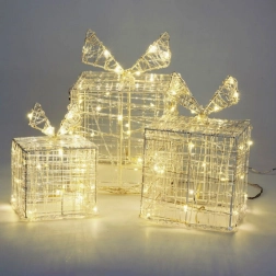 Skab en magisk julestemning hjemme og ude med et sæt på tre dekorative gaver med LED-belysning. Kombinationen af hvidt metal og klar akryl fremstår moderne og ren, og det varme hvide LED-lys giver dekorationen et behageligt, festligt præg. Takket være de forskellige størrelser kan du nemt arrangere en virkningsfuld komposition ved træet, på terrassen, i hallen eller i udstillingsvinduet.
